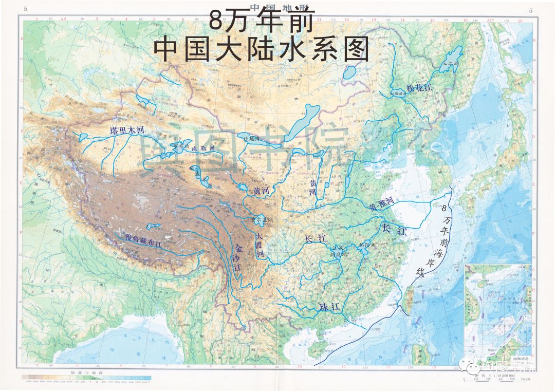 (8万年前水系图,鄱阳湖和洞庭湖已经连接在一起,长江正式贯通,不过此时由于陆地封存了大量的冰川,海平面比现在低一些,外海在过去是陆地,而长江,黄河,乃至辽河,鸭绿江等,过去是交汇在一起入海的)