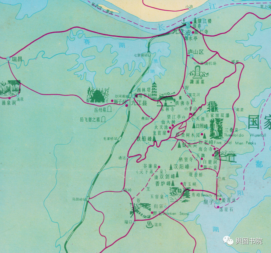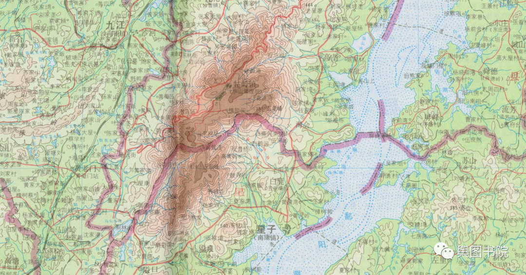(庐山地形图,1988年。庐山的深色海拔和周围绿色的平原显得格格不入,这也是这座山的神奇之处)