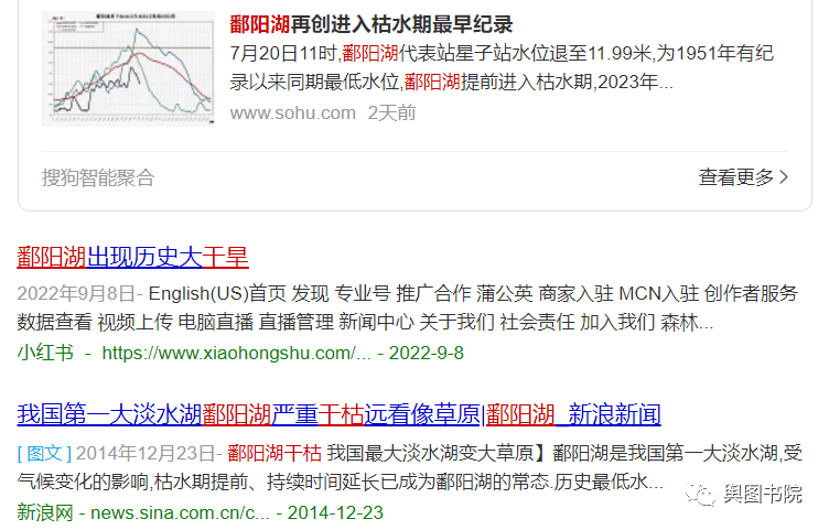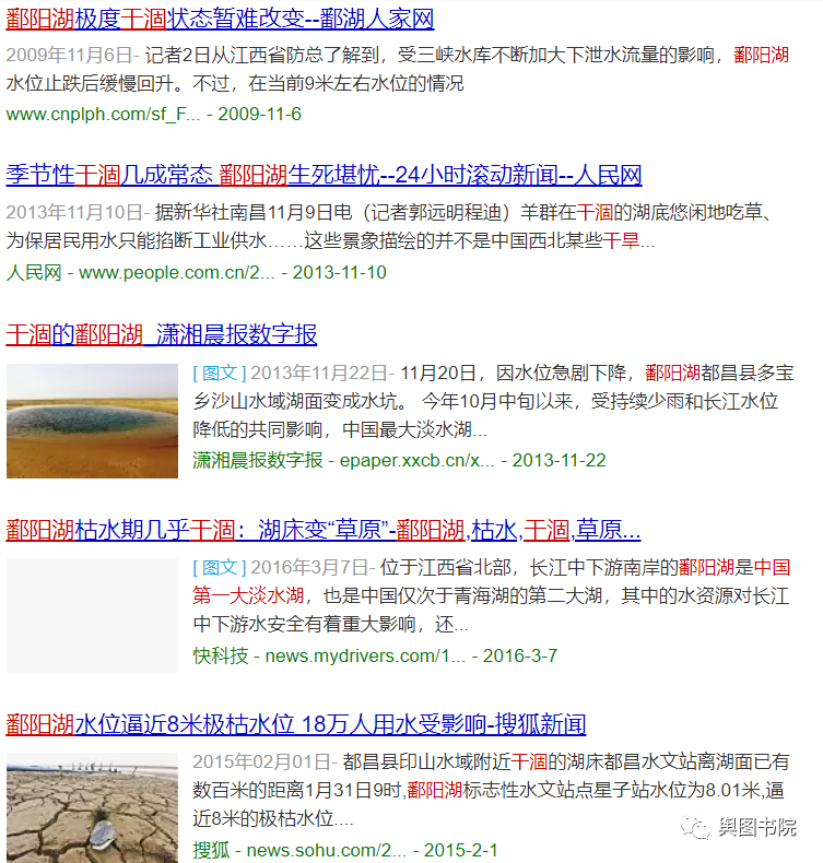 (输入“鄱阳湖干涸”的新闻截图,这个湖几乎年年都创下低水位纪录,缺水已经常态化。相关原因,戳链接了解更多:鄱阳湖地图与枯水干涸原因)