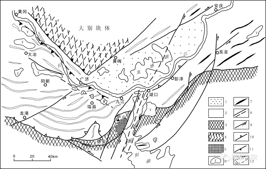 (鄱阳湖地区构造图,从白垩纪到开始,庐山和鄱阳湖地区的相对移动就已经开始了,至今两边已有数公里的相对位移。不过,远古的庐山已经被岁月磨平,后来在喜马拉雅造山运动期间,受扬子地台外围伸展断裂影响,湖盆加速沉降,庐山地区抬升,新的庐山拔地而起,大致形成今天的格局)