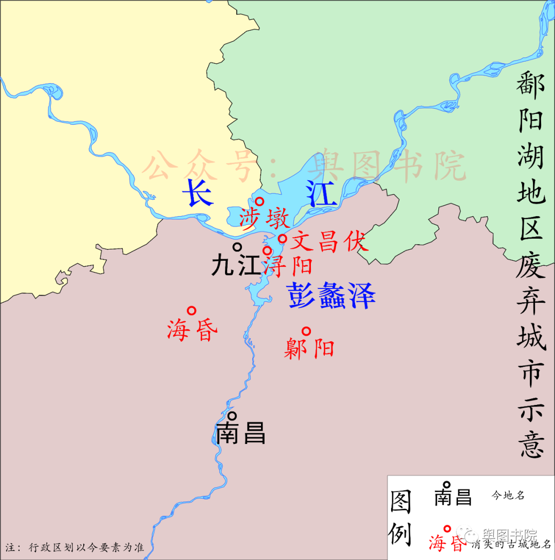 (西汉时期的鄱阳湖和消失的古城示意图,本文作者制图。当时鄱阳湖叫彭蠡泽,此后湖泊北面废弃并向南侵蚀,一些城市沦入水中)