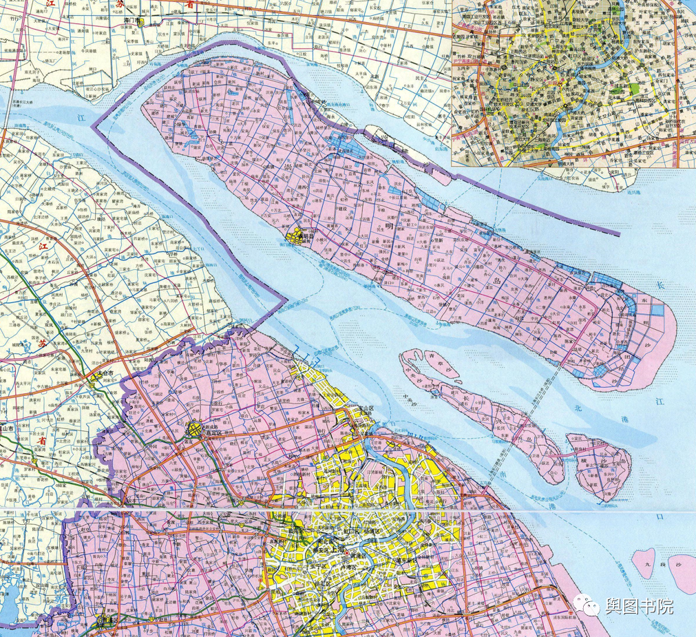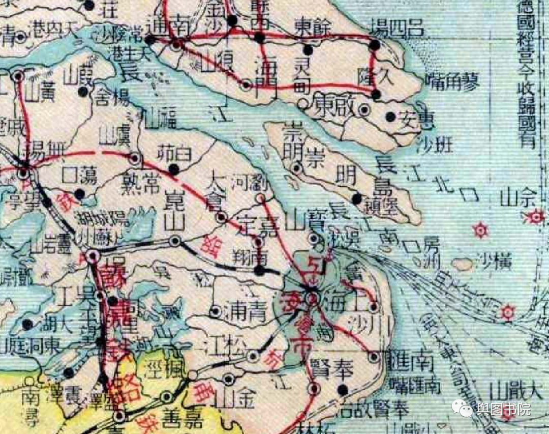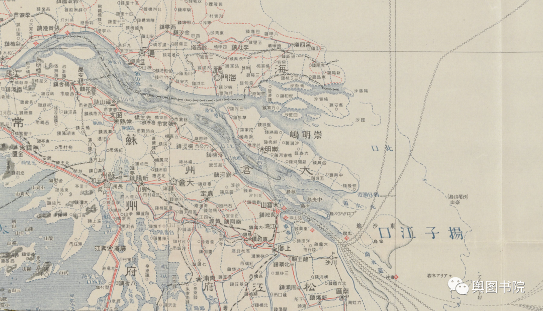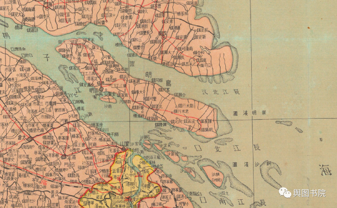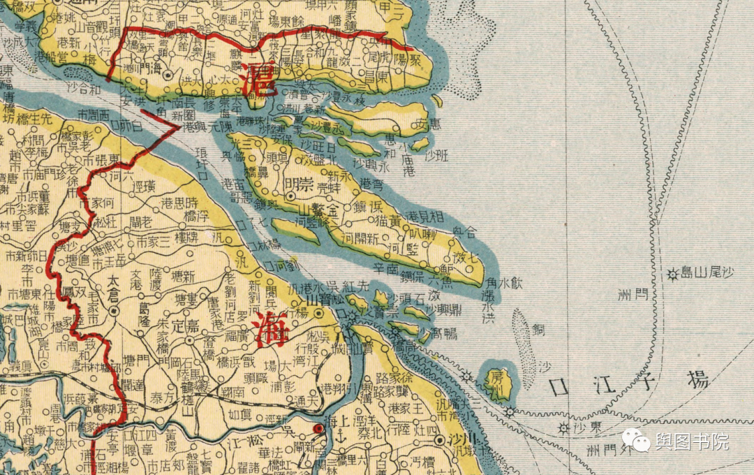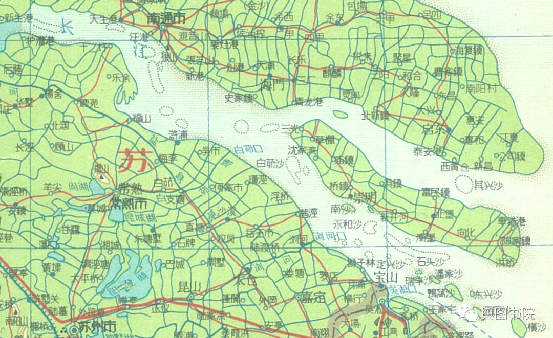 1933年的地图,我们看到启东那里彻底和北岸连在一起,长江口大型岛屿只剩下崇明岛一个。在消失的启东岛,图中仍有河道示意,说明中间还有过流机会。