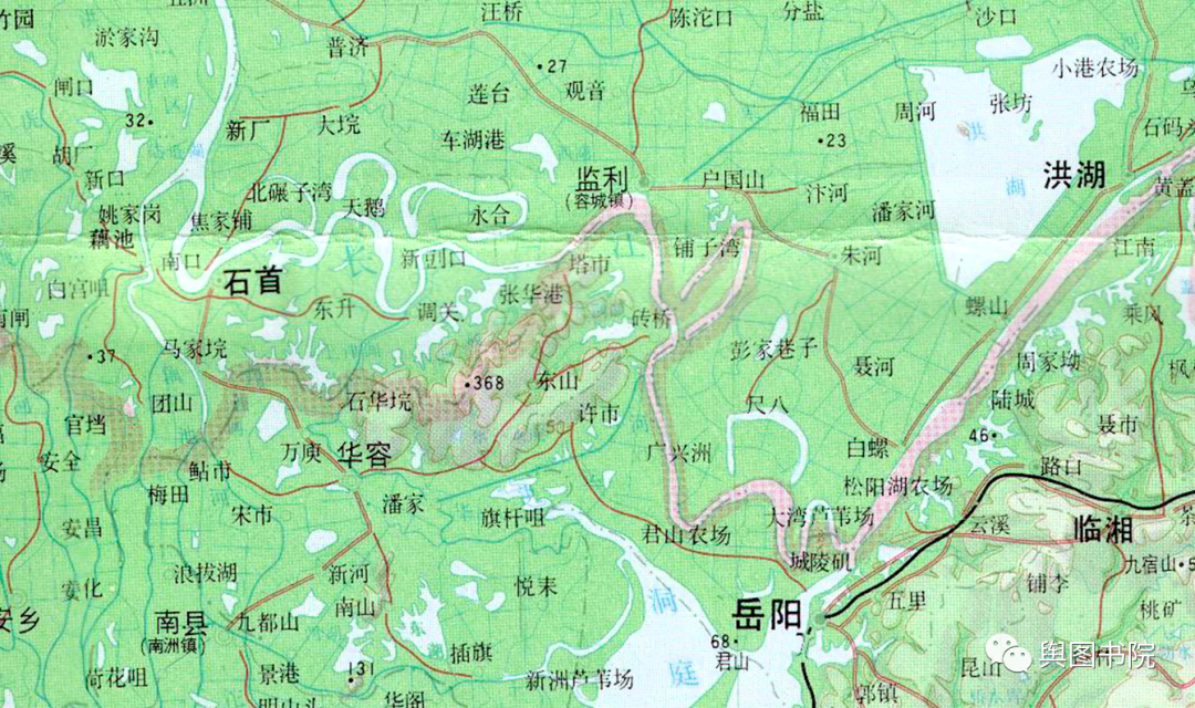 1997年地图,我们看到,和过去相比,老河道已经彻底和新河道分开,变成了牛轭湖。在新的长江河段,藕池口,监利县,城陵矶成了长江新的转弯点,这里也是现在防洪关键地带。