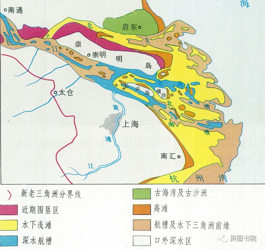 长江口经历了自然沉积和人为围垦,表现出陆进海退的特征,地图上记录了这一变化。