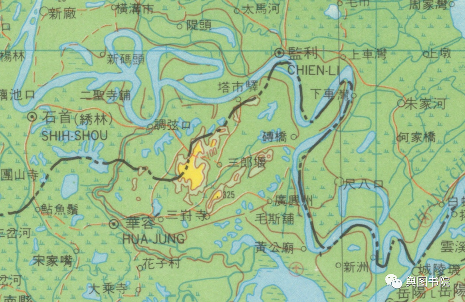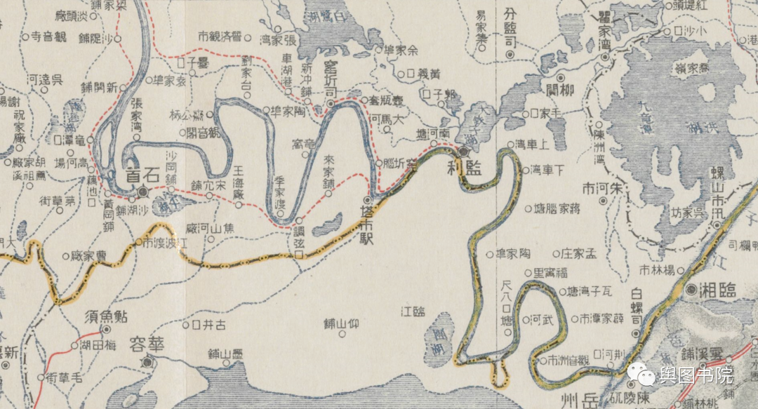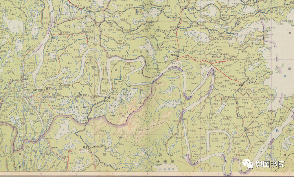 在1897年地图上,我们能看到荆江地区河曲的分布,东段的省界基本上也沿着江分布。只是在尺八口塘南面那里不重合,这里据考证是源自1870年的一次长江自然裁弯取直过程。