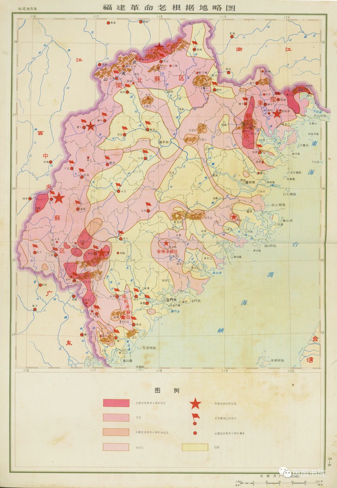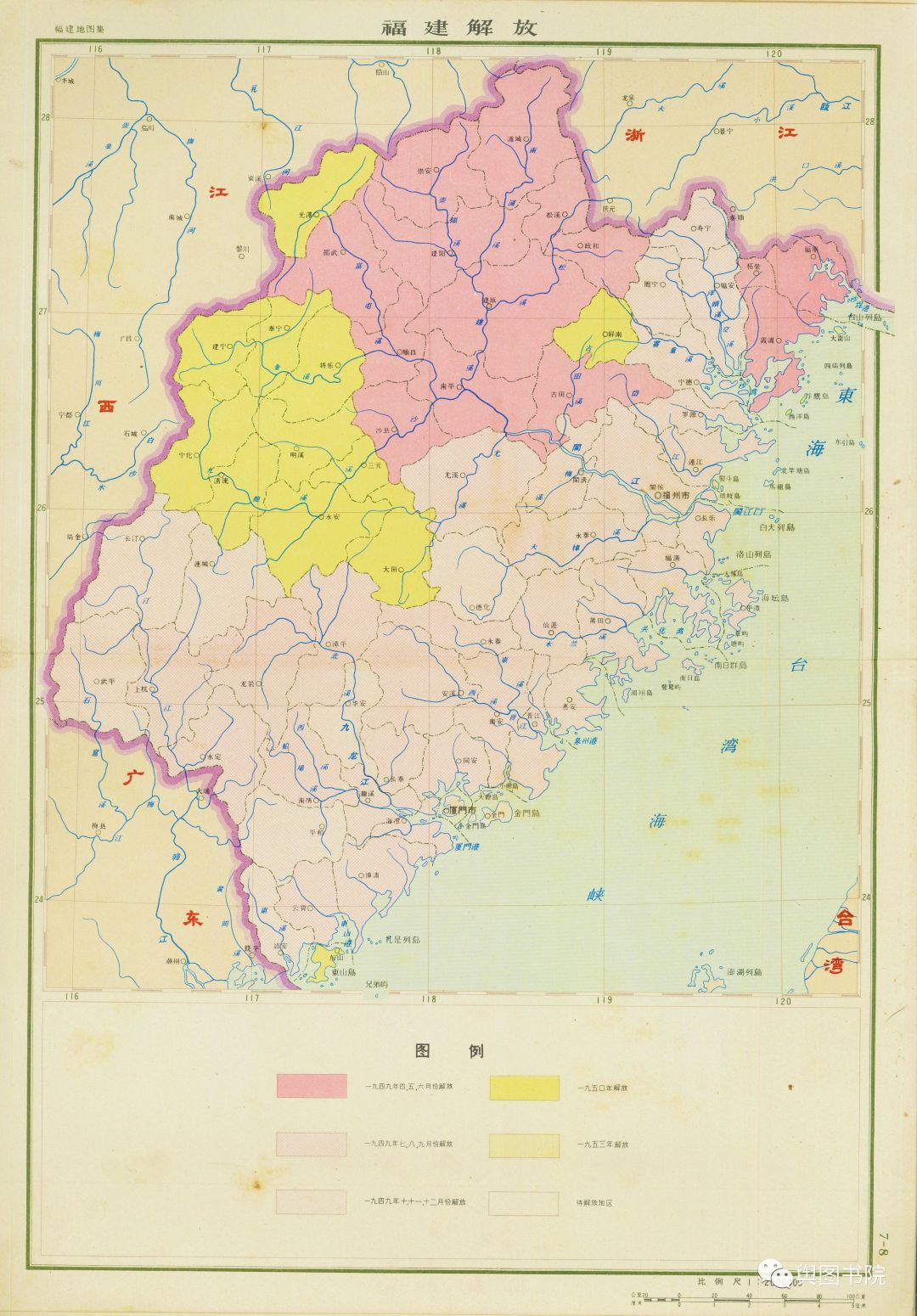 这幅图反映了当时军事推进的现状,1949年,大部分区域解放,但是山区和沿海岛屿还有一部分未解放区域。到1962年成图时候,还有金门马祖等岛屿未解放。