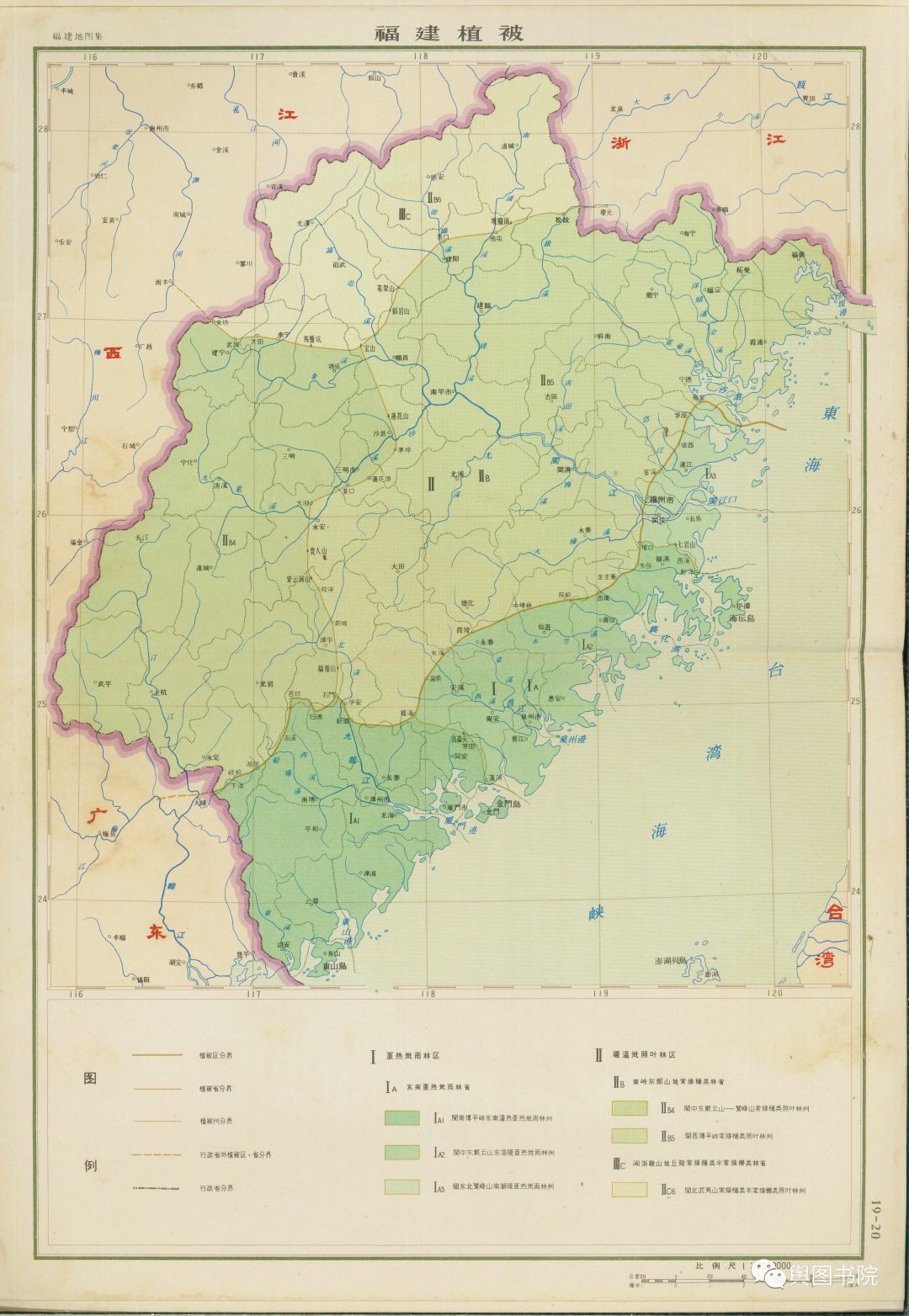 1962年的福建地图上,植被的分类方式和今天不太一样,过去所说的暖温带,接近现在的中亚热带,而过去所说的亚热带,大致相当于今天的南亚热带地区。由于水热条件较好,福建全境都能发育茂密森林。