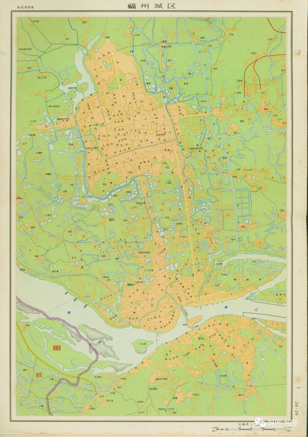 福州长期是双核城市,但是1962年的福州,比建国初有了较大扩展,主要是沿着交通线扩展,南北两个核心逐渐连为一体。往期内容可以参考图文舆图纪实:1951年中国城市图(南方篇),速看~1917年的中国城市图的福州部分,看福州几十年的变迁。