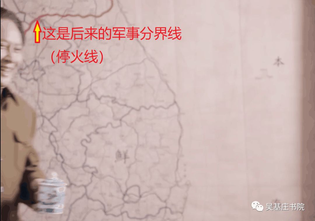 看到没有?这里面可是清楚标记了三八线。三八线没错,但是这条线,是战后的停火线,而不是战前雅尔塔协议划定的三八线。再仔细看底图,这个底图是今天的图,而且是电脑制作的图,这就满满的违和感了。