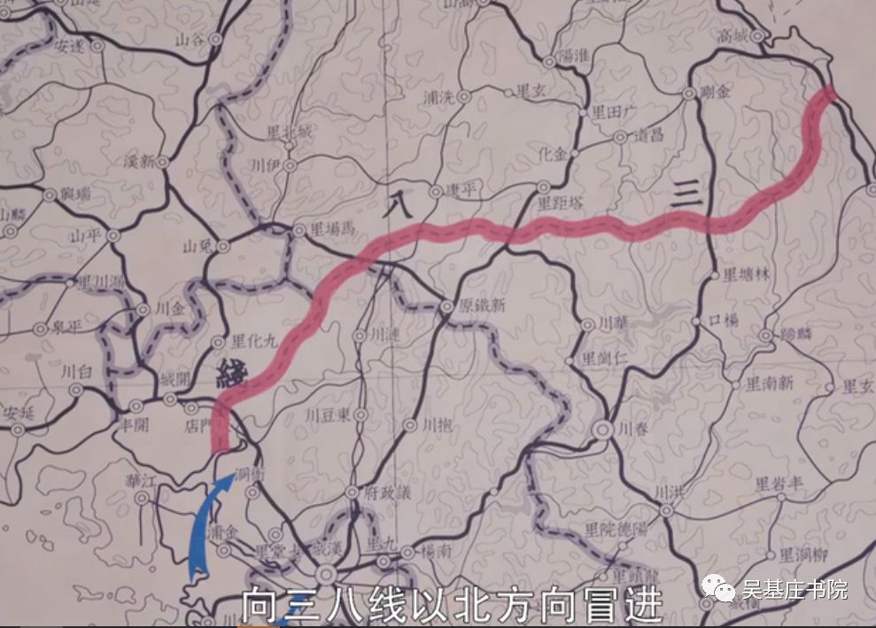 此图有了三八线,但是不起眼,看下图,很不起眼的标注了一番。