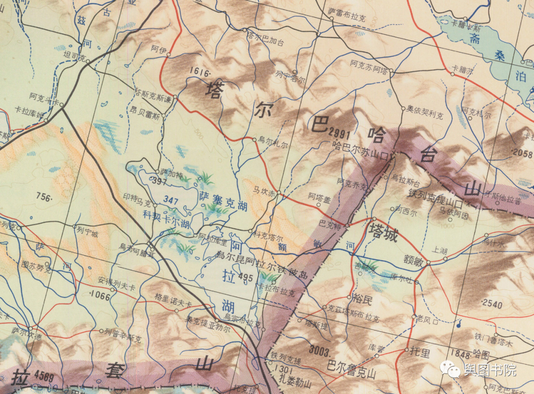 (福海县地图,可以看到额尔齐斯河和乌伦古湖,几乎贴在一起,似乎只是一个田坎就构成了分水岭)