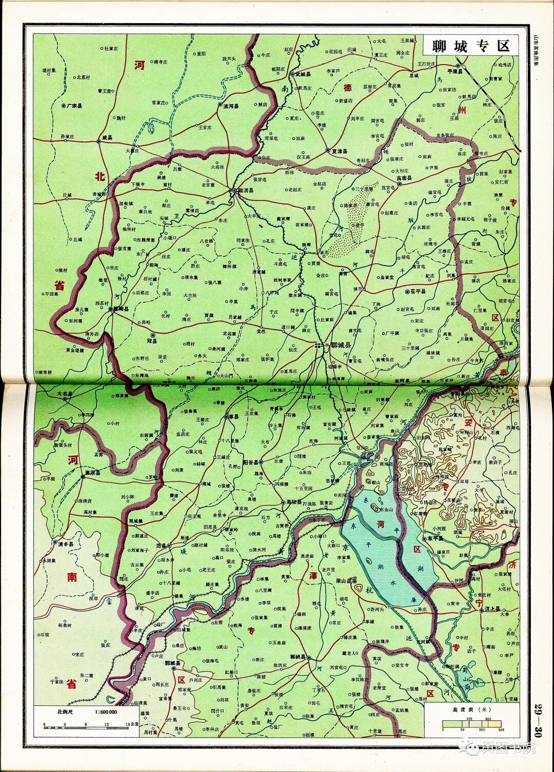 1964年聊城专区,是聊城比较大的时候,次年这里位于黄河和金堤河夹角所在的区域划给河南。聊城以前辖区内有聊城,临清等市,但是1963年,这些市降格为县。聊城在建国初,属于短暂出现的平原省,后来平原建制撤销,回归了山东。从地形看,聊城地形和德州差不多,但是因为处于德州上游,地势略高一些,西部是黄河冲积扇所在地。