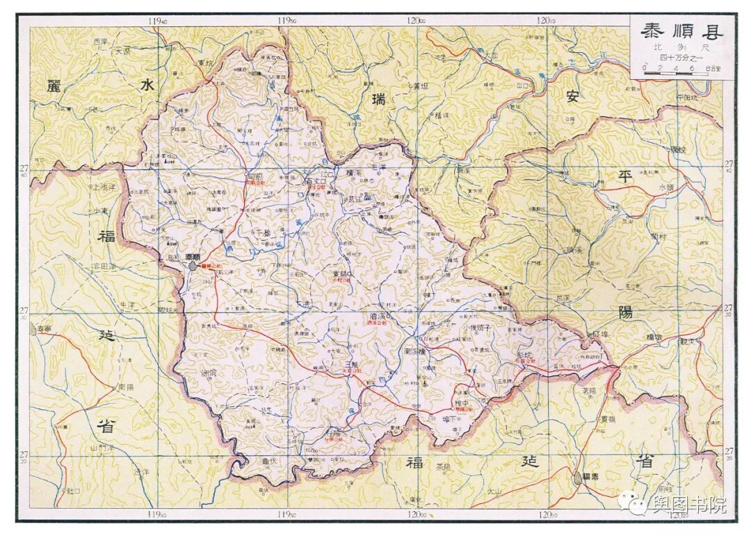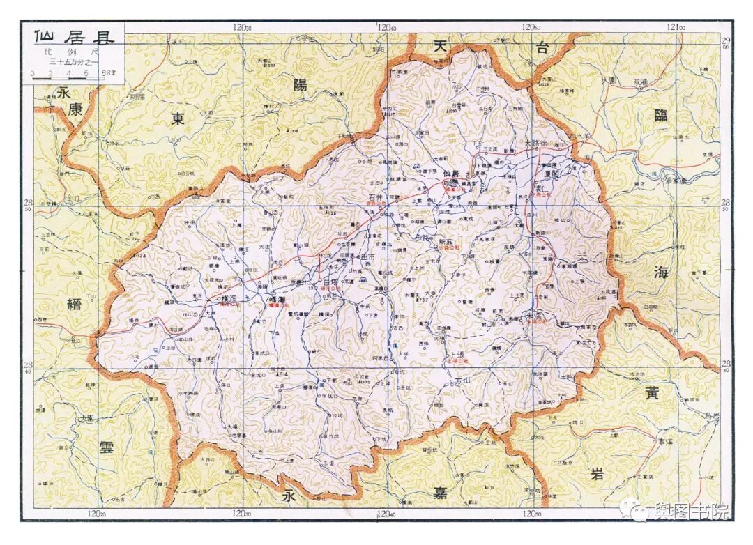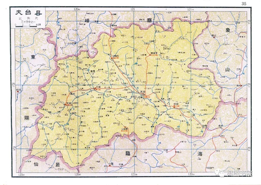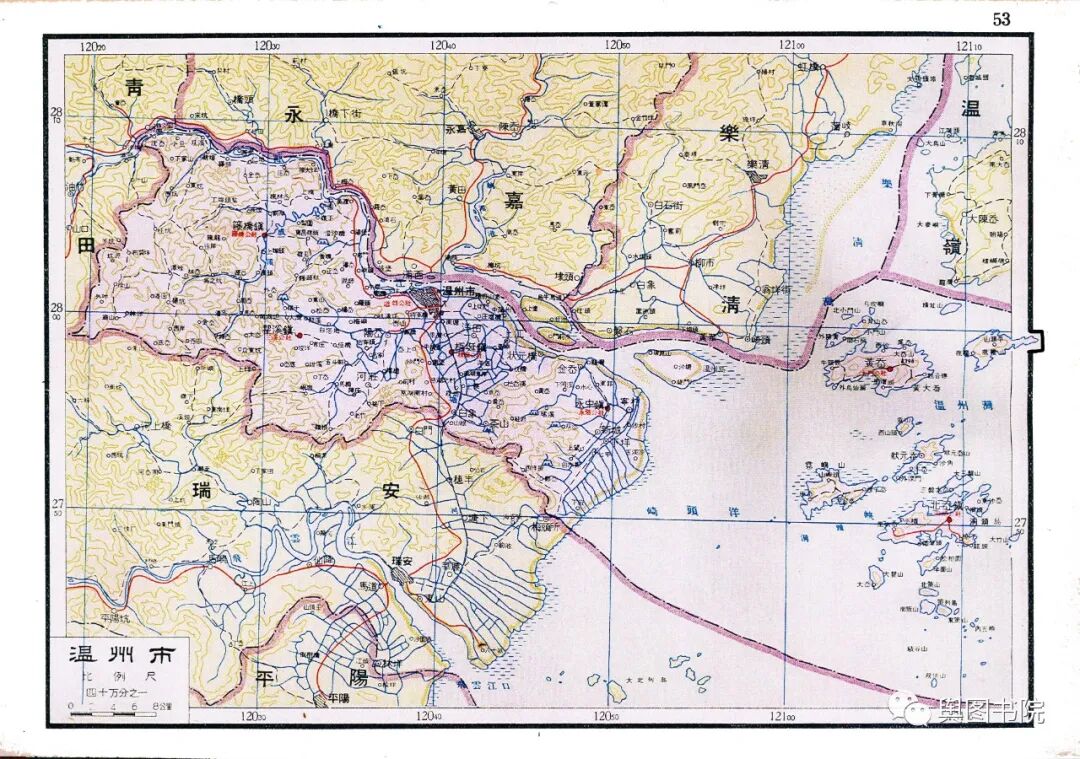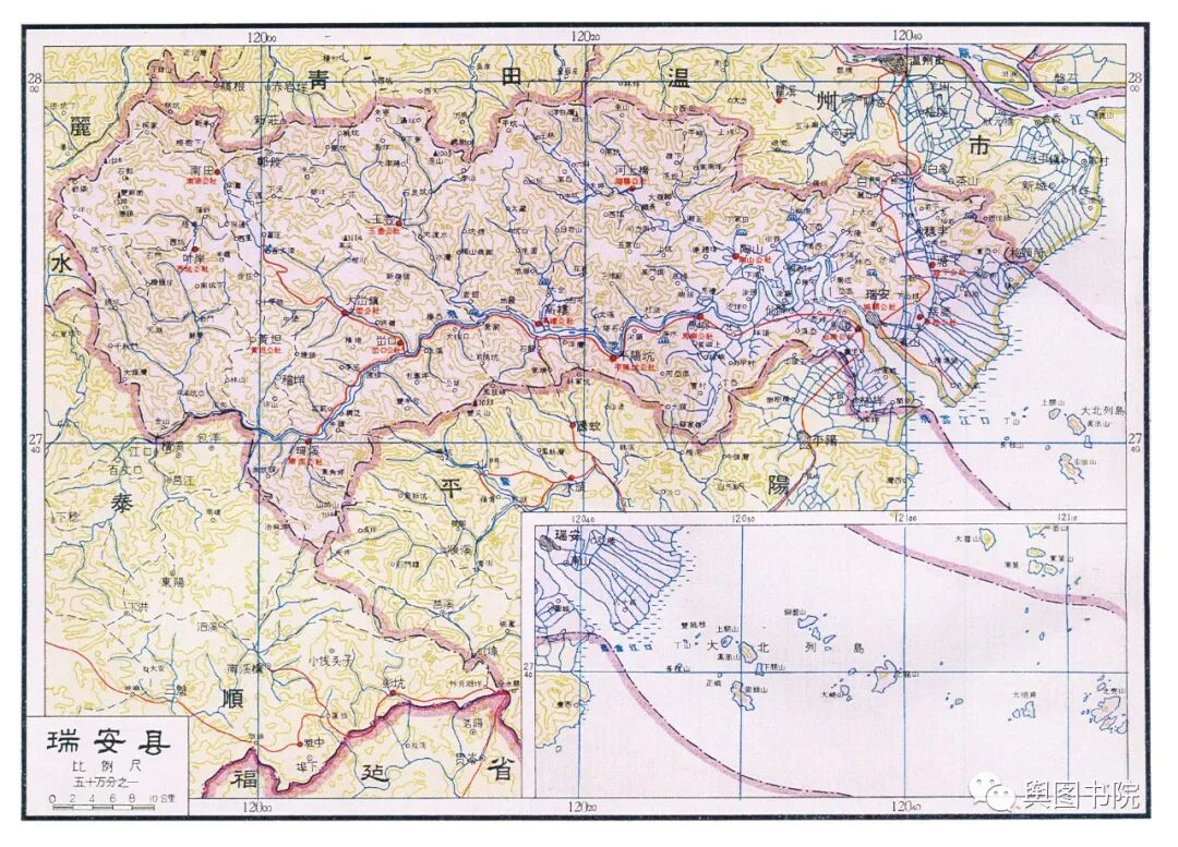 瑞安县是当时浙江浙江最狭长的一个县,最西端在铜铃山,最东在海面的北麂岛,直线距离都有100多公里。图中的瑞安县,是合并了文成县只有的又大又长的瑞安县。今天的瑞安,扼守飞云江河口,面向大海,发展得非常不错,温州地铁也通到了瑞安。
