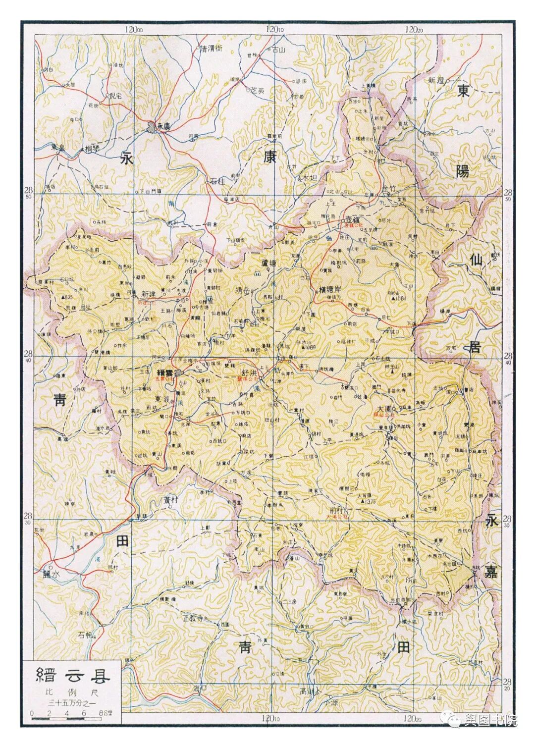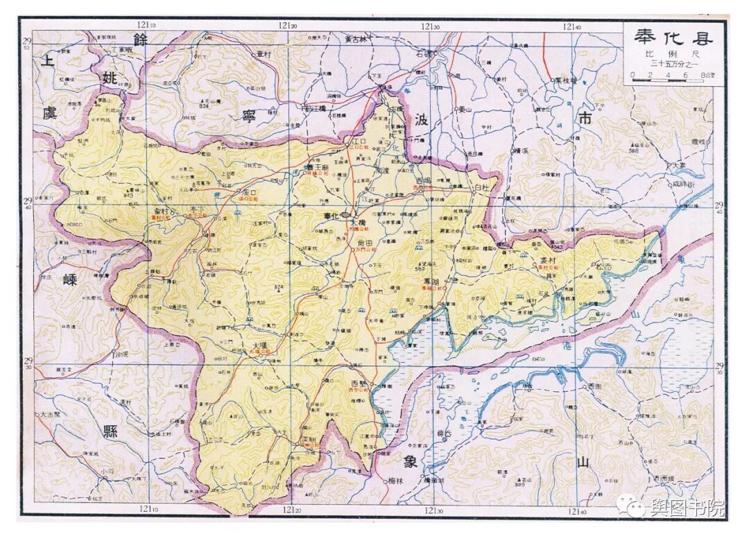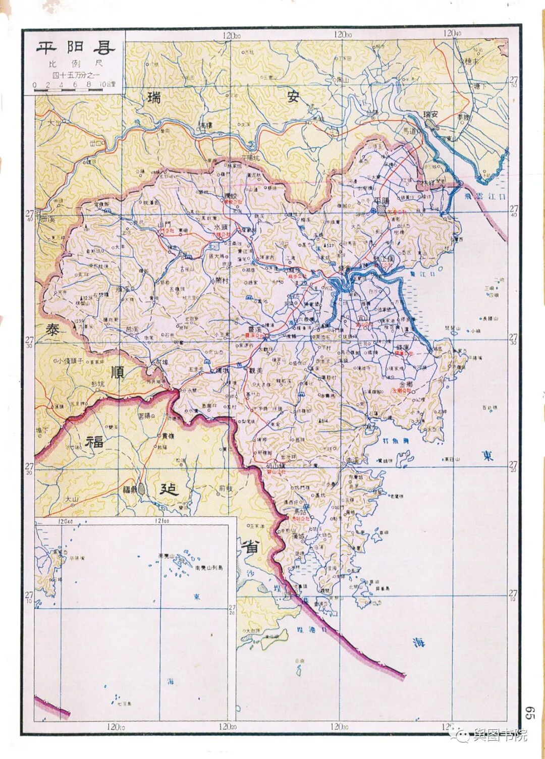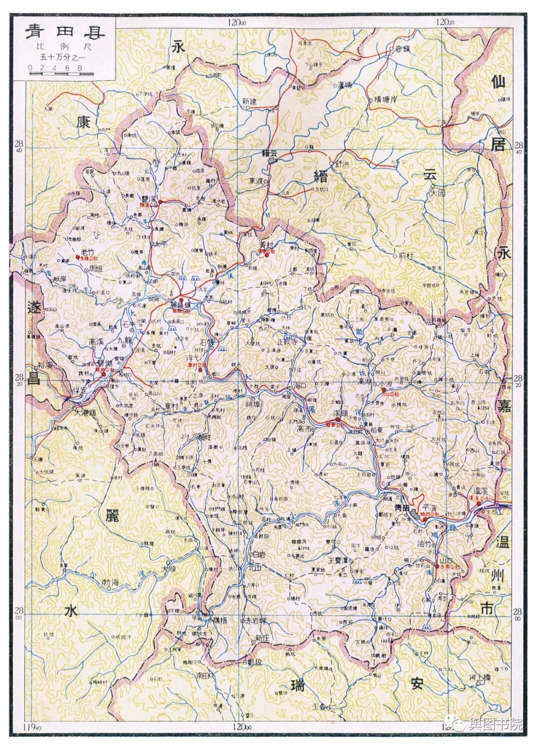 瑞安县是当时浙江浙江最狭长的一个县,最西端在铜铃山,最东在海面的北麂岛,直线距离都有100多公里。图中的瑞安县,是合并了文成县只有的又大又长的瑞安县。今天的瑞安,扼守飞云江河口,面向大海,发展得非常不错,温州地铁也通到了瑞安。