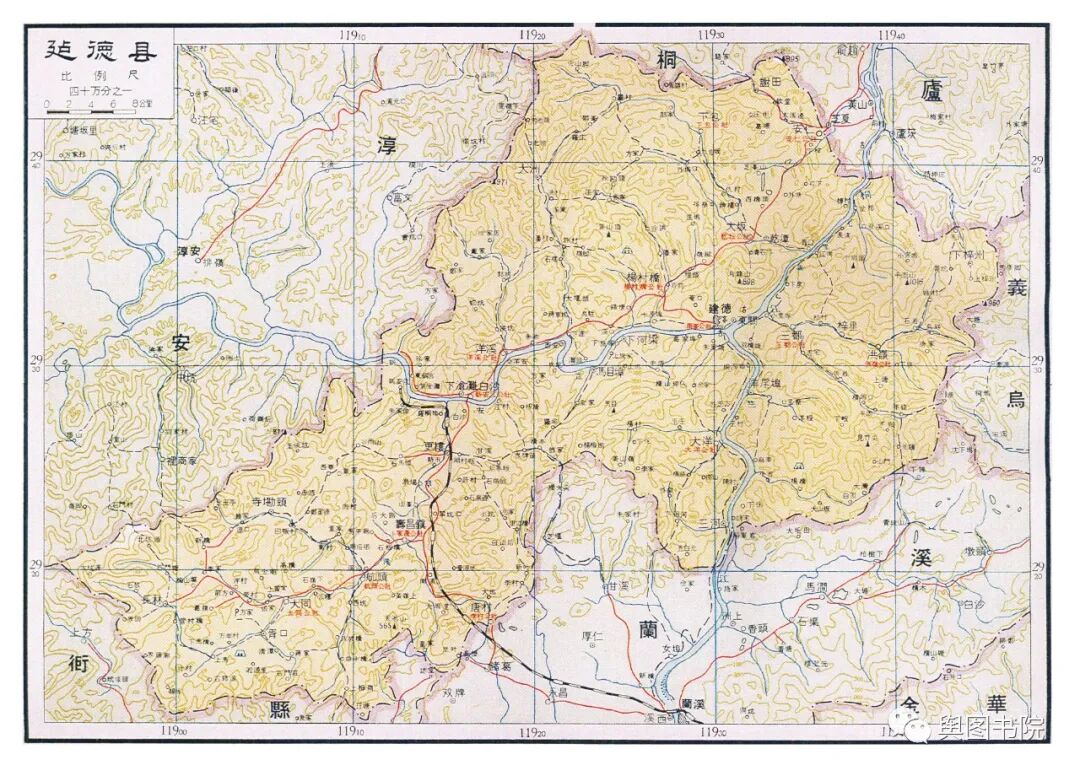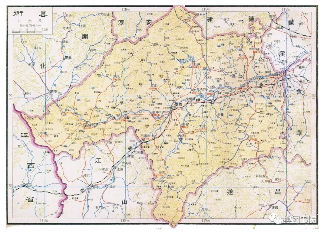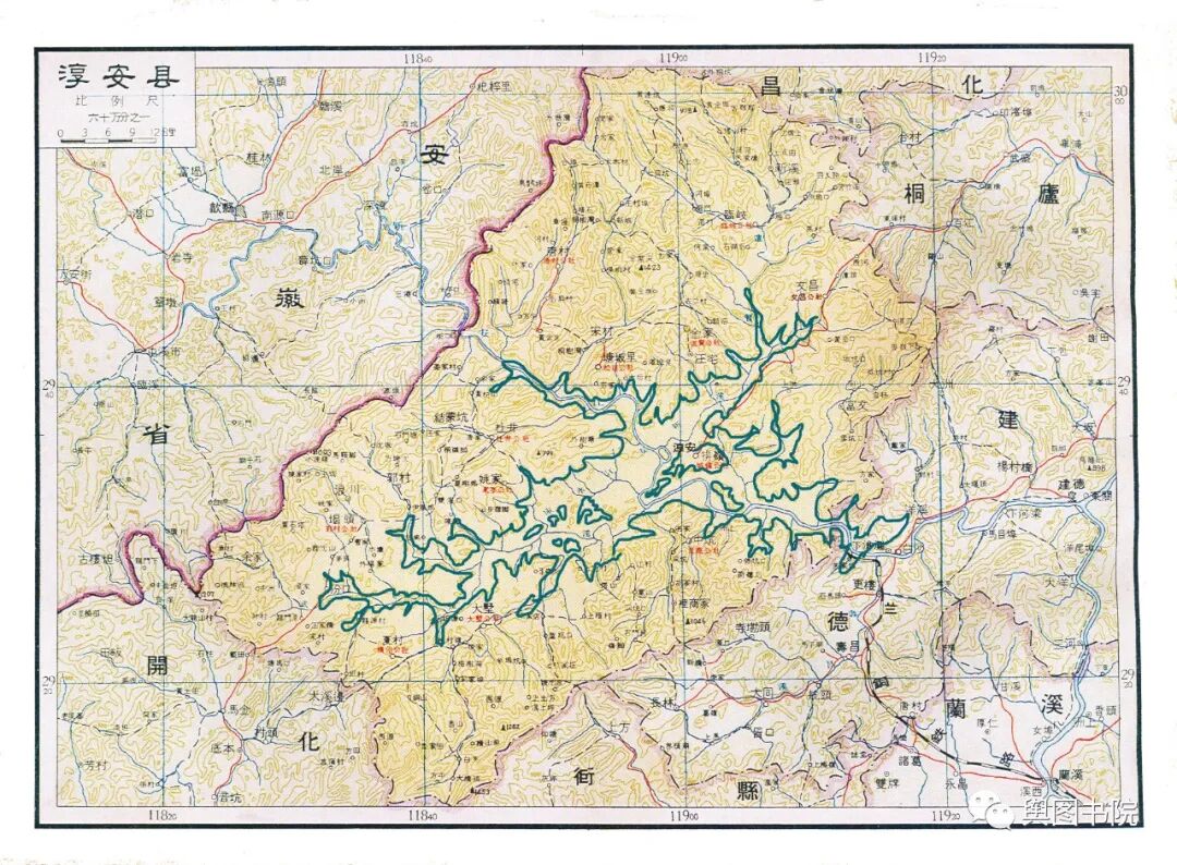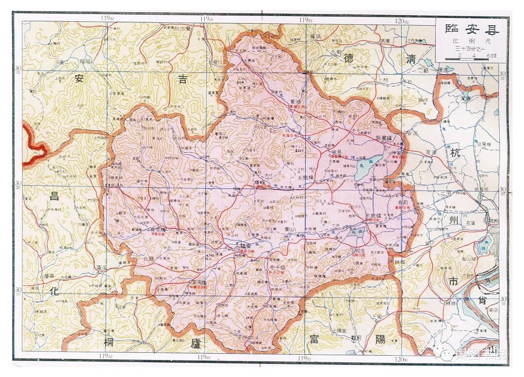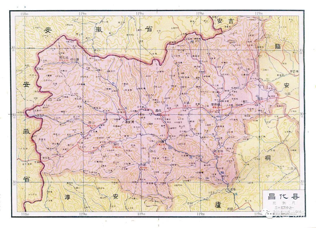 昌化县是一个已经消失的县,这个县很古老,唐朝的时候就有,60年代撤销,并入了临安县。这张地图也是昌化在地图上最后的遗存。