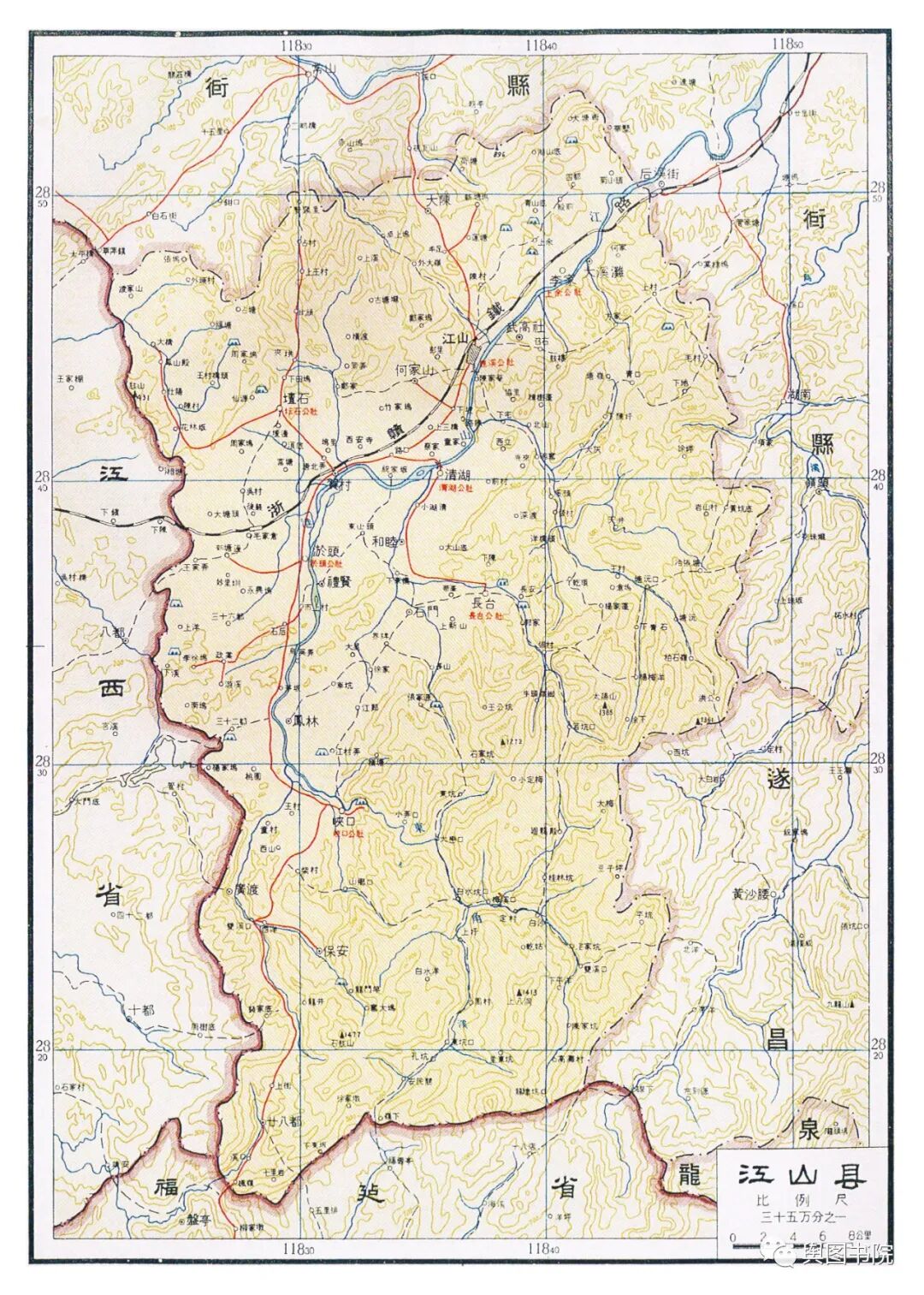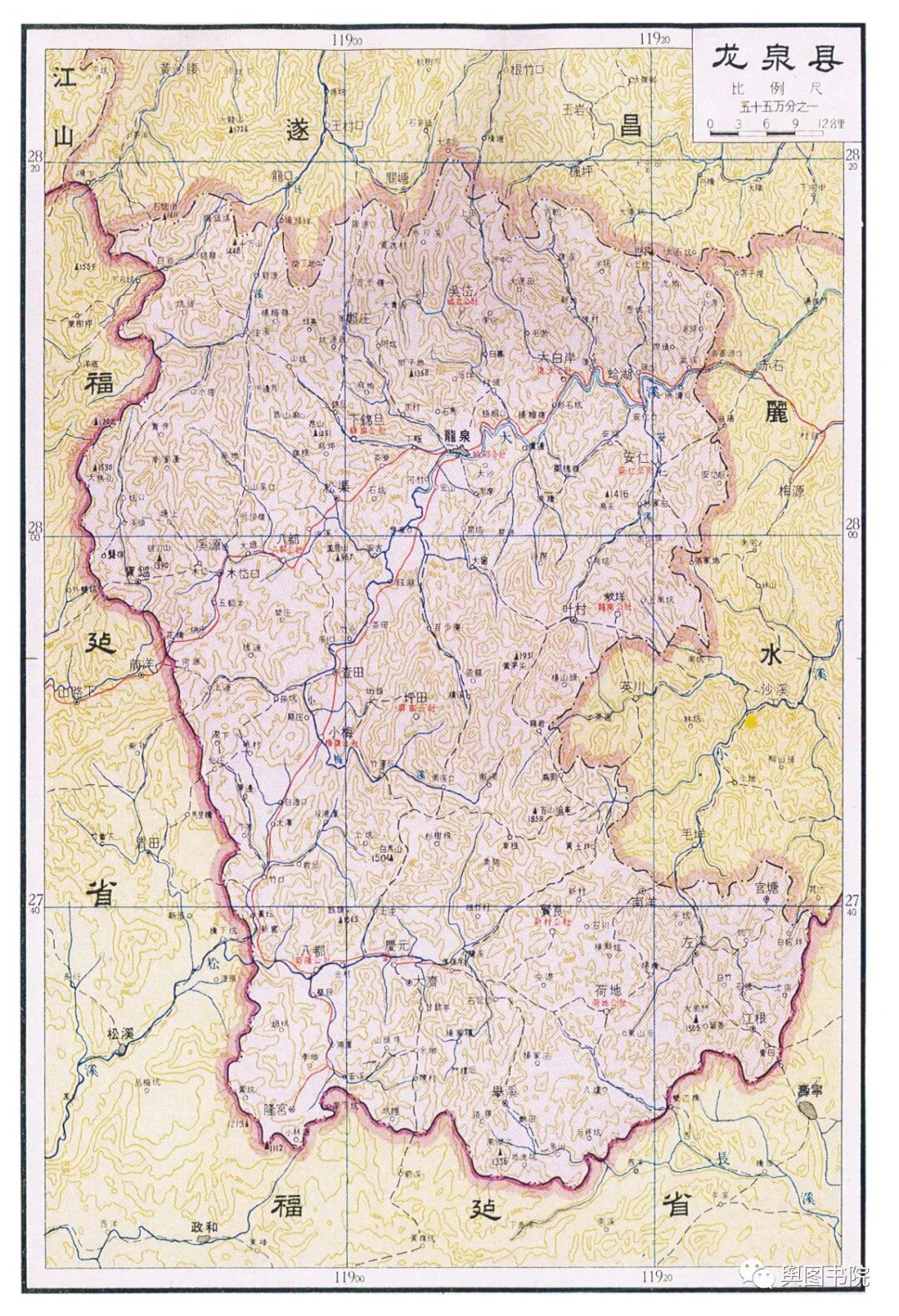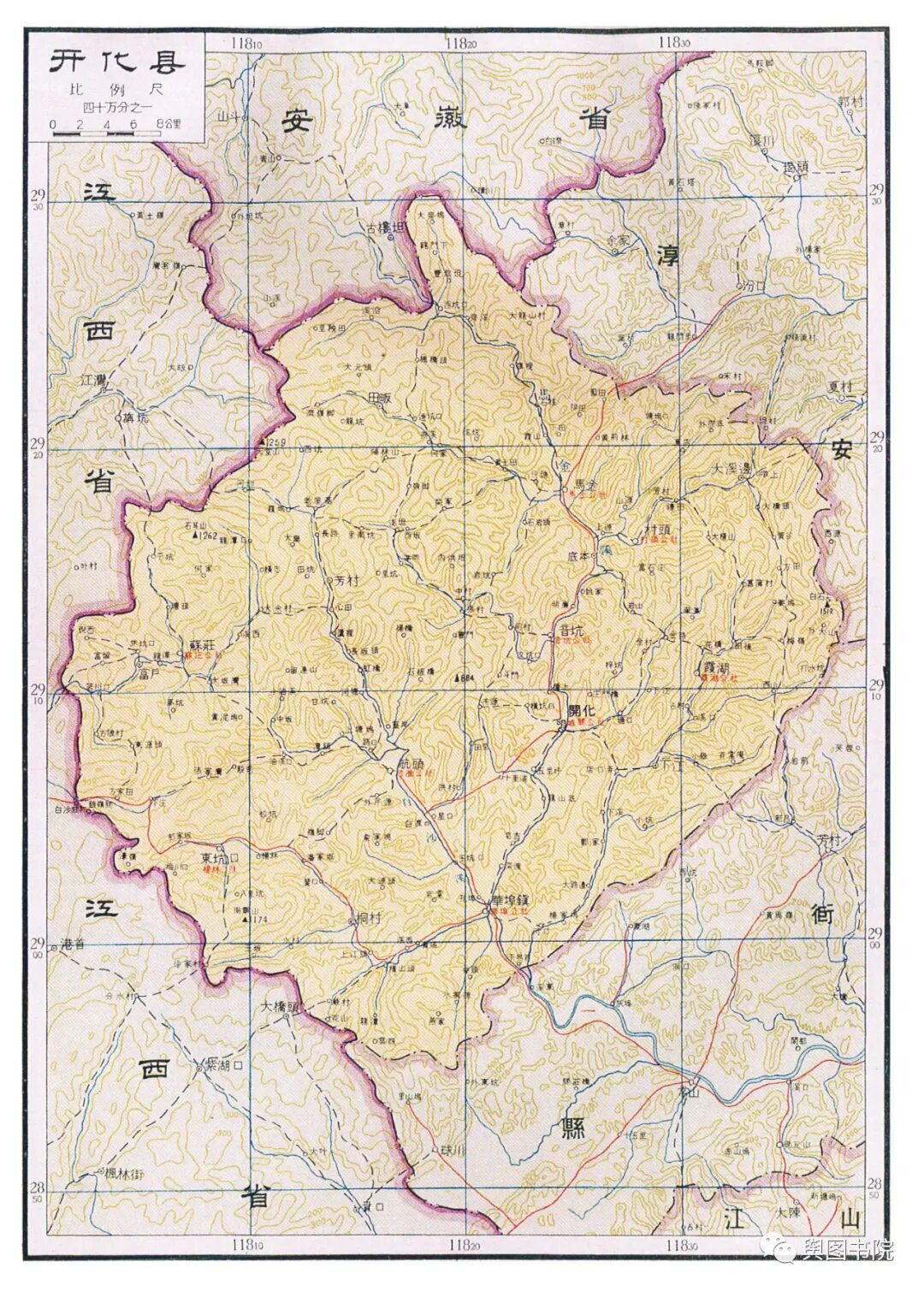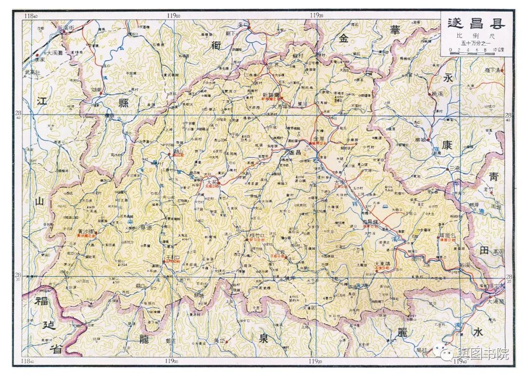 昌化县是一个已经消失的县,这个县很古老,唐朝的时候就有,60年代撤销,并入了临安县。这张地图也是昌化在地图上最后的遗存。