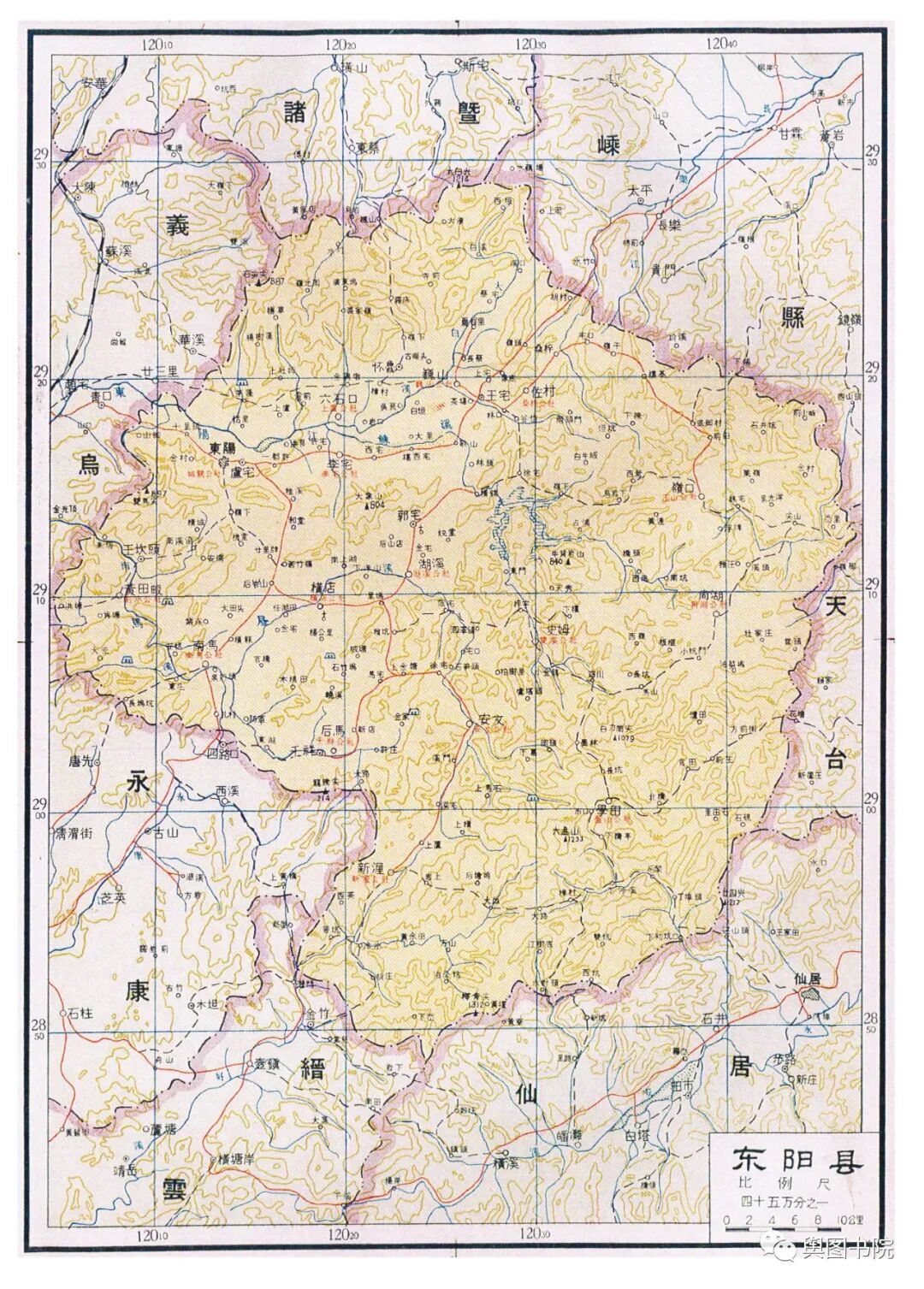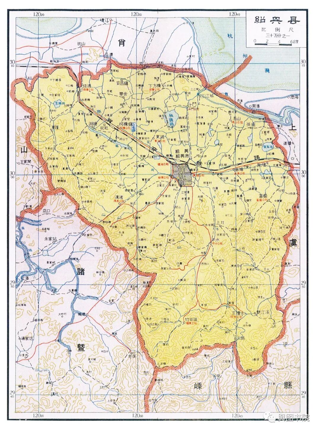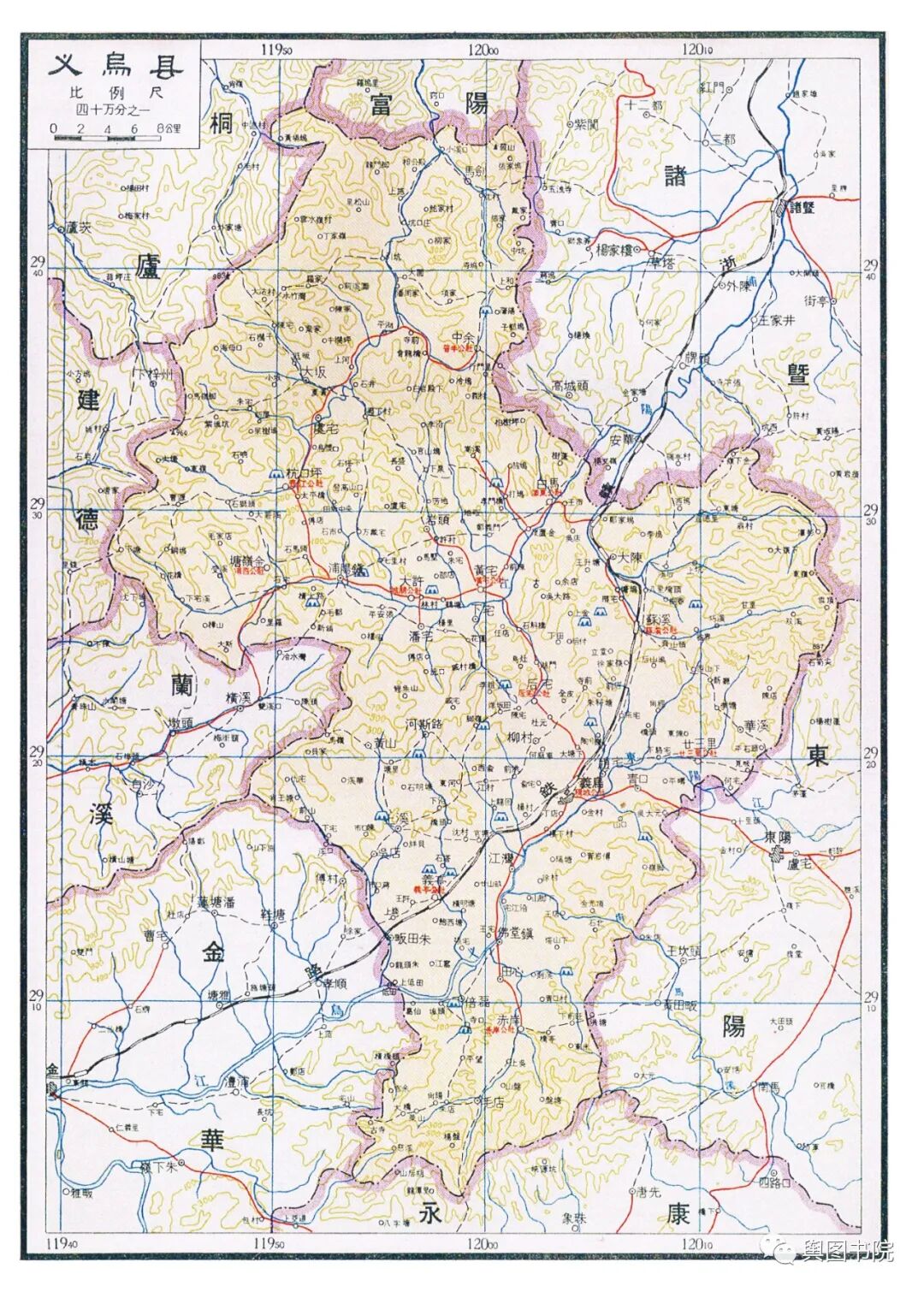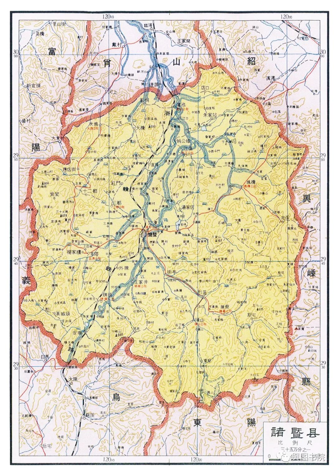 在上文提到的政区图中,诸暨县绘图有误,这个县是宁波专区的,政区图中误记到金华专区。诸暨也是浙江的古县城,设置以来一直沿革至今。