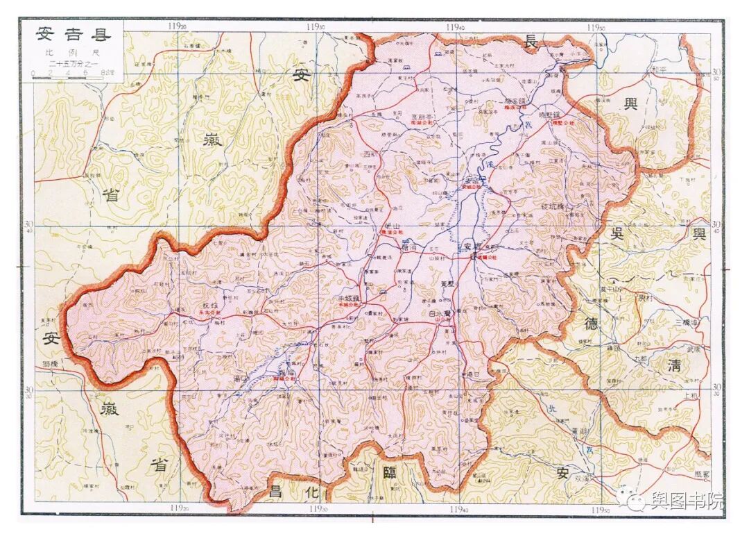 安吉县在汉朝时候就已经设置,后来历经变迁。图中的安吉县,是1958年合并了孝丰县之后的安吉。