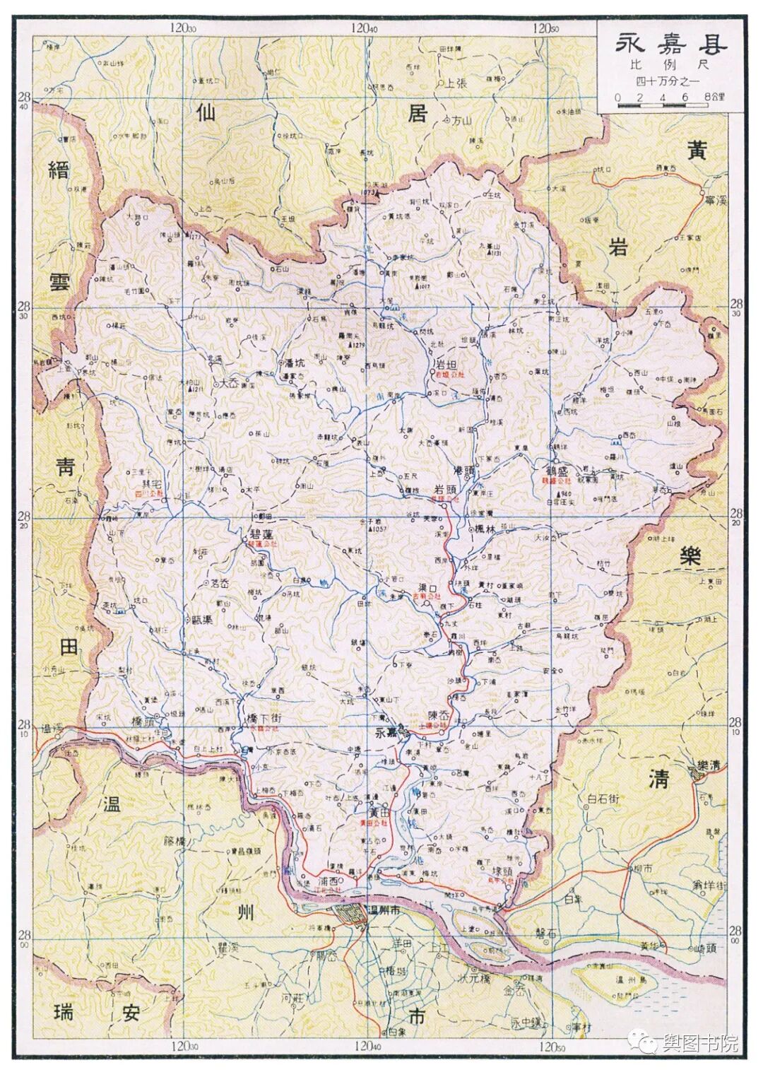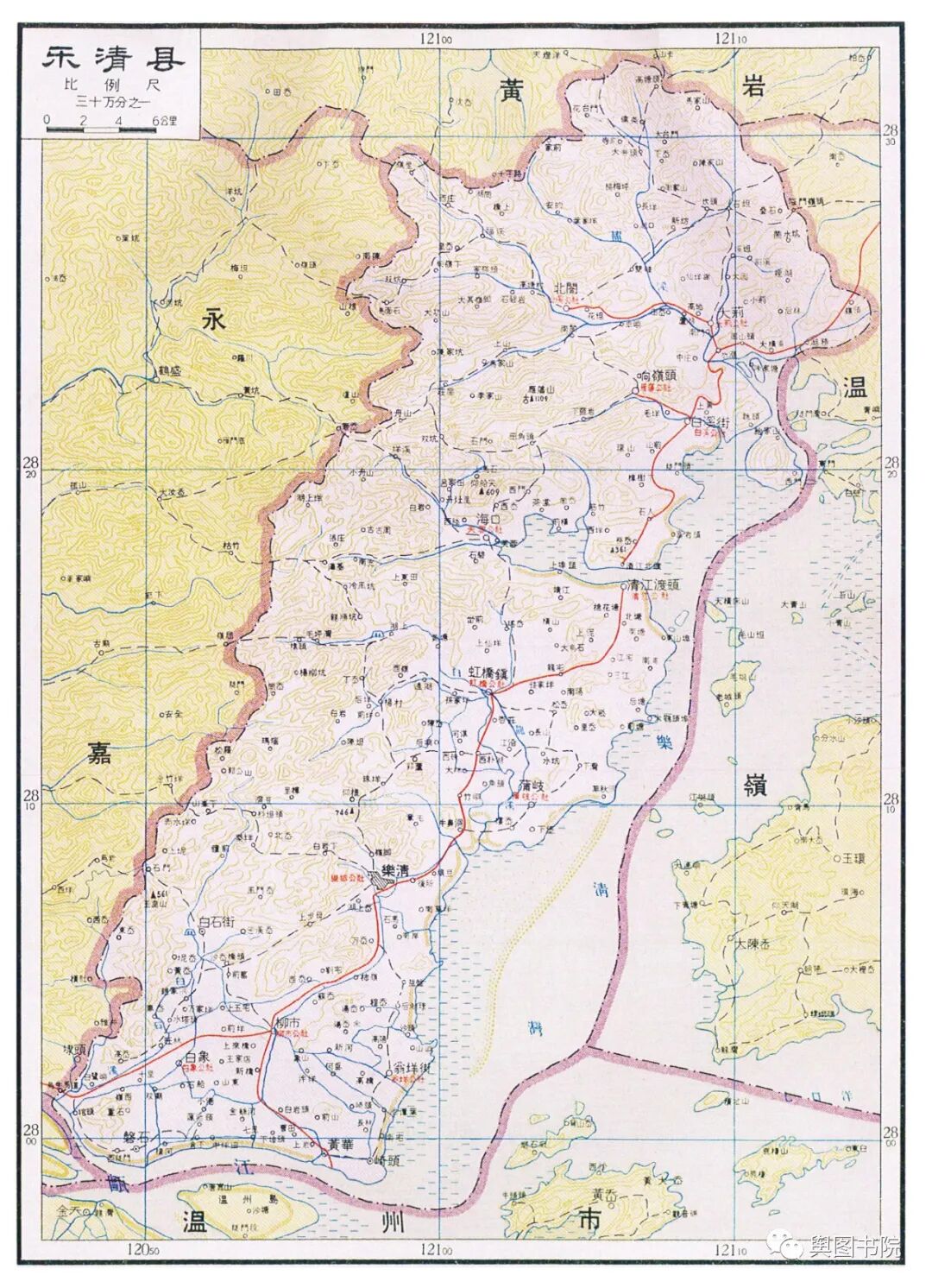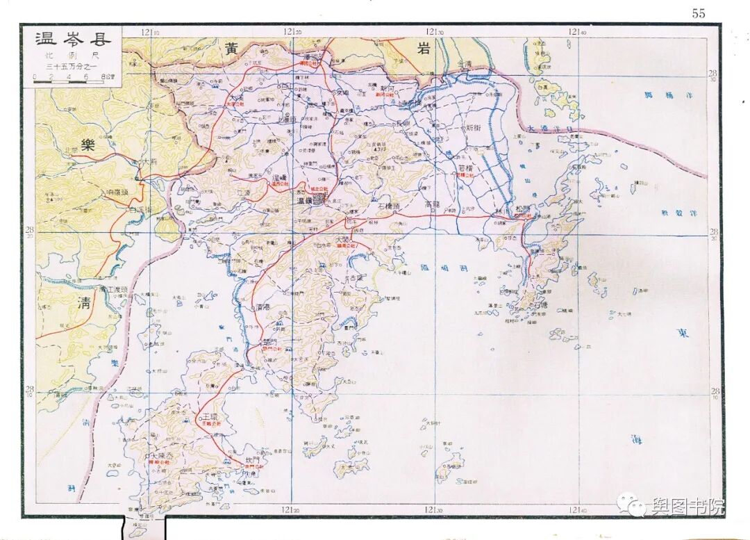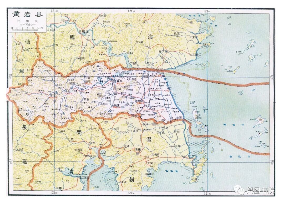 乐清县位于瓯江口北岸,图中的乐清,和现在界限完全一样,这里属于变动比较小的地方。这里现如今是沿海经济发达地区,温台经济模式发源地。北部雁荡山是著名旅游胜地,著名的世界地质公园。