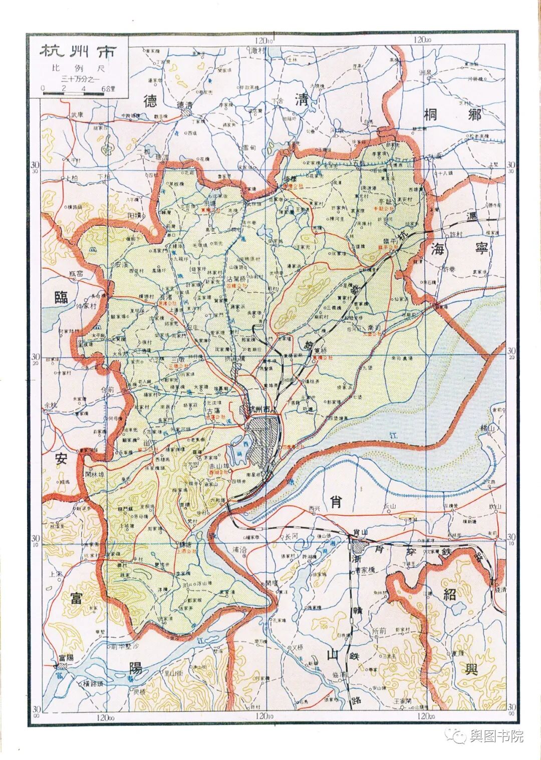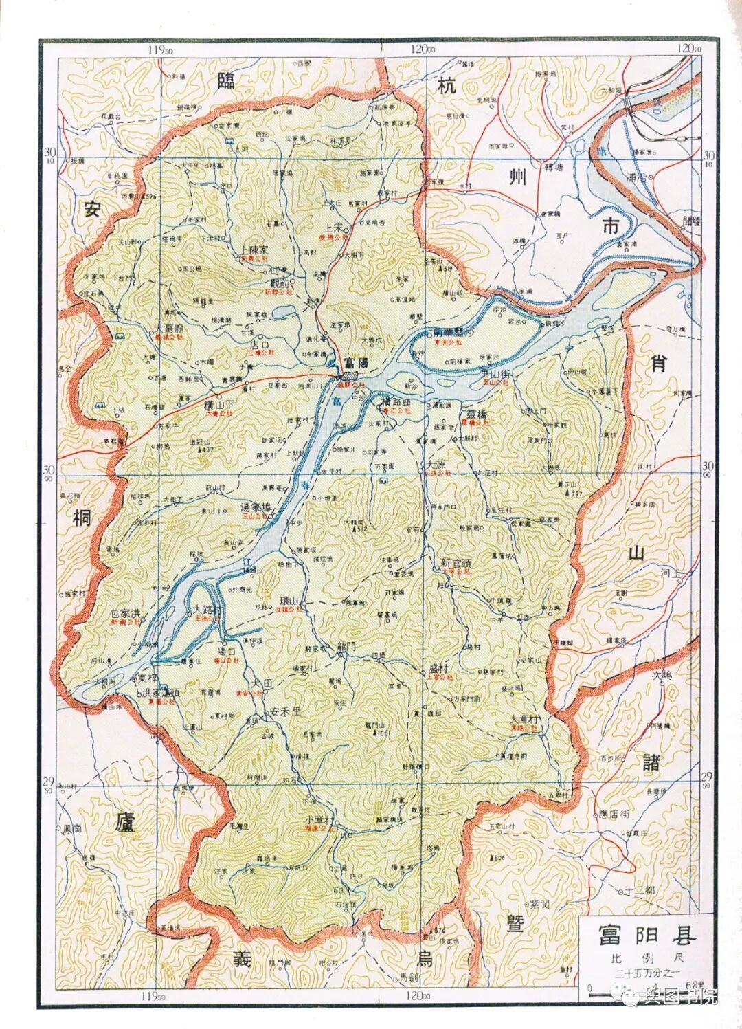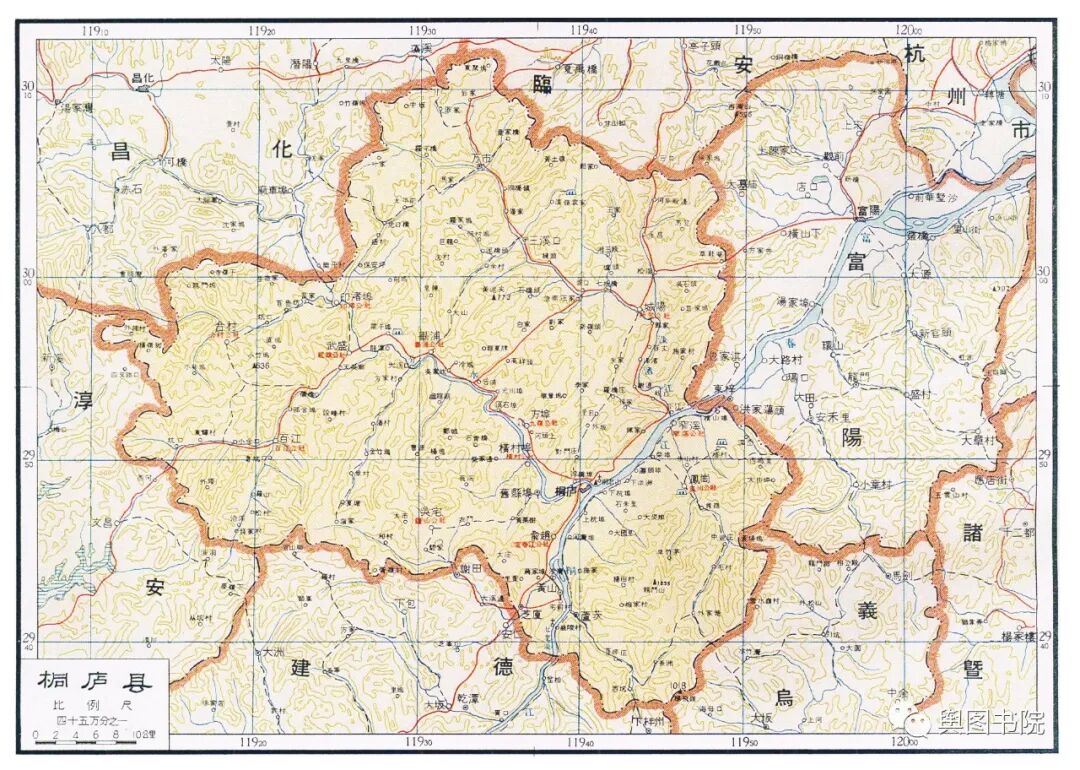 桐庐县位于钱塘江上游富春江沿岸,自古以来便是山水圣地。图中展示的富阳,是1958年合并了新登,分水两个县。1960年,富阳县一度撤销并入桐庐,这一变动未在地图体现。1961年,恢复富阳县时候,又将原新登县辖区和分水的一个乡镇划出,所以今天的桐庐虽然没有恢复合并进去的县,但是辖区比这幅图展示的要小一些。