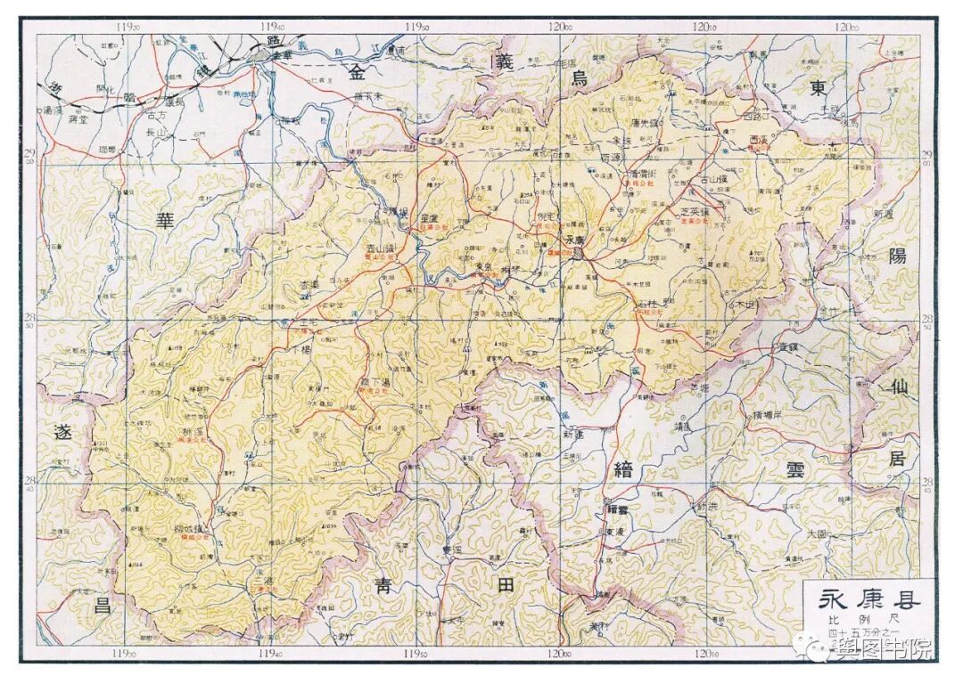 永康设置于三国时期,得名于字面含义。实际上中国还有一个永康,在甘肃省。1913年,甘肃的永康因为清理重名县更名为康县。这副地图上的永康,也是短暂出现的大永康。1958年武义县撤销并入永康,但是1961年武义县又恢复了。