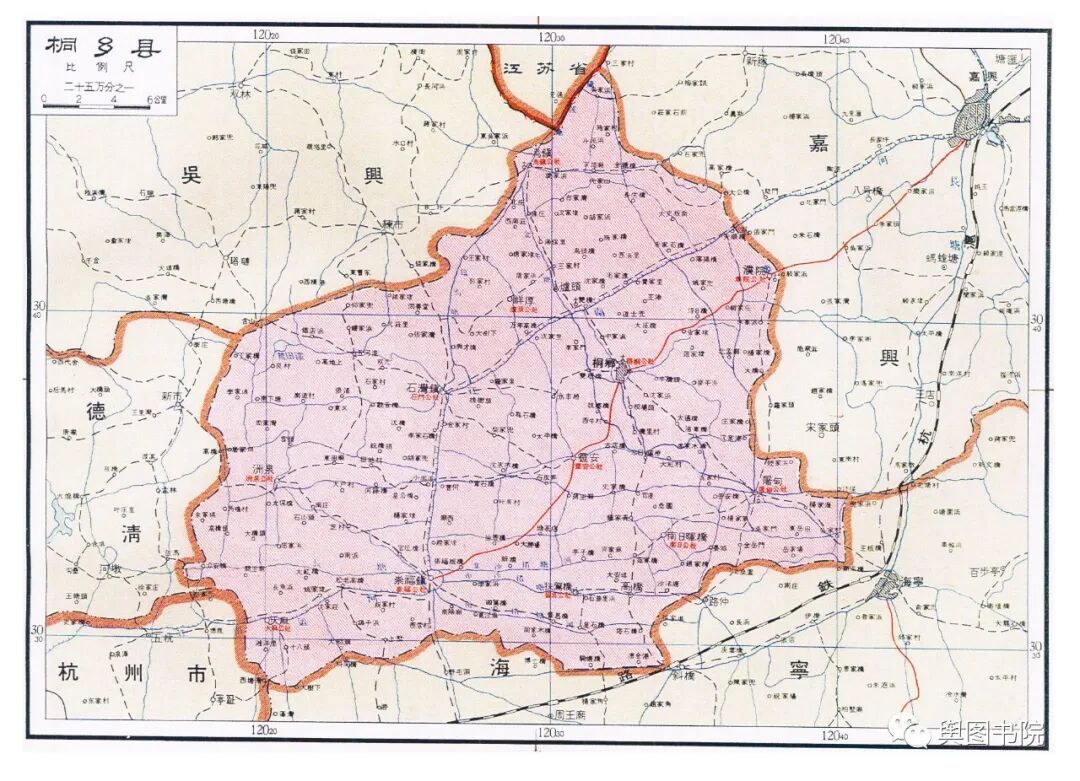 地图上的桐乡县,也是刚刚扩大面积的桐乡,1958年合并了崇德县。这里河网密布,人口稠密,是鱼米之乡,目前是县级市。