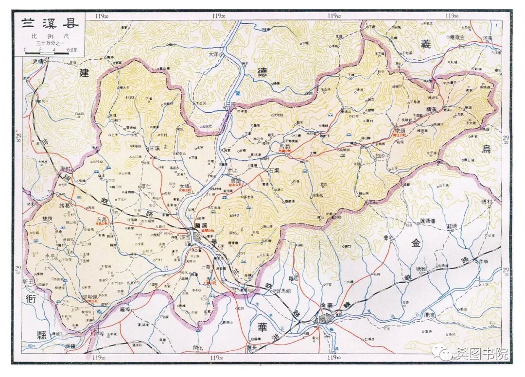 兰溪地处金华盆地北部,图中金兰铁路,兰铜铁路,是配合新安江水库修建的铁路,是兰(溪)铜(官坝)铁路专用线,又叫做兰(溪)新(安江)铁路专用线。1958年建成,号称浙江最美铁路,可惜2009年铁路停止运营,铁路废弃。