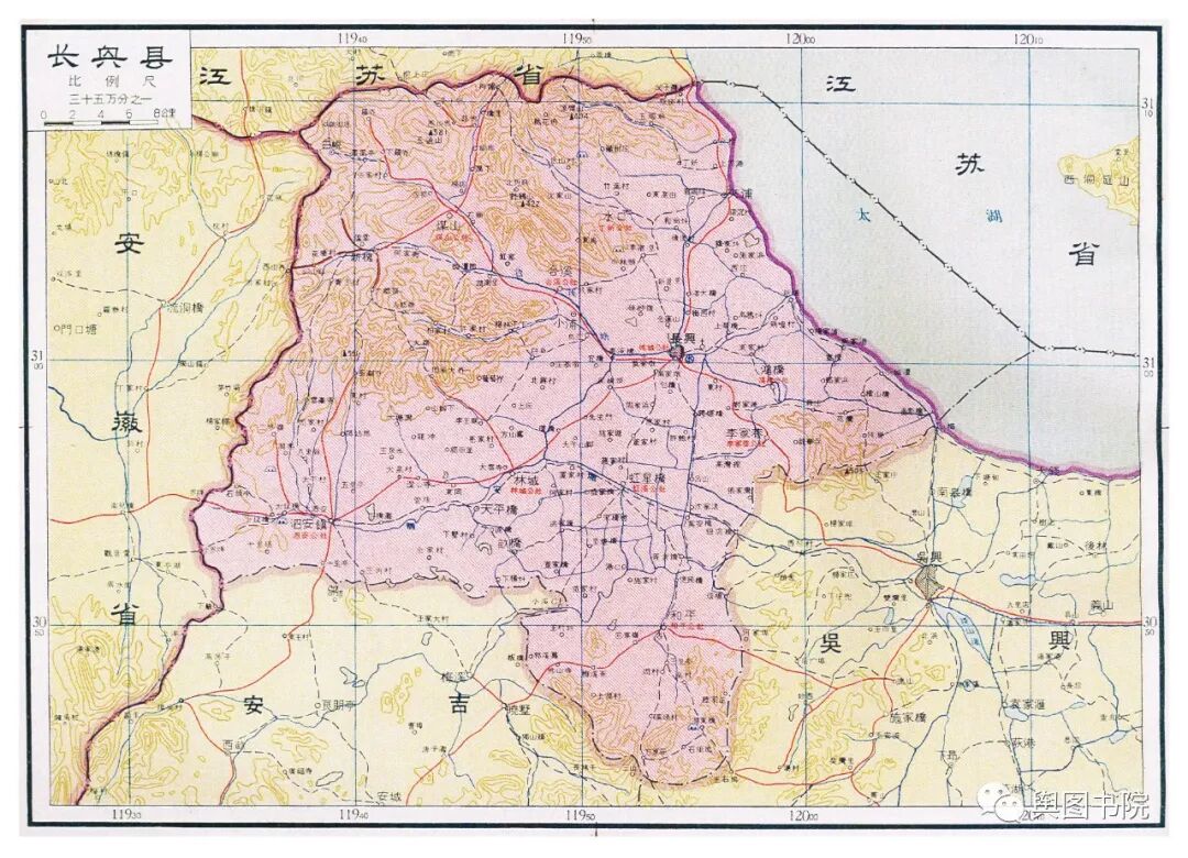 长兴是浙江,江苏,安徽三省交接处的一个县,扼守太湖之滨。仔细观察可以发现,地图中的省界和加粗示意的县界并不重叠,从省界看,这里是有一段太湖湖面国土的,而从县界看,是没有的。这个源自两省的界限调整,太湖水面实际上已经全部划给了江苏省,这里省界可能是旧资料的省界。