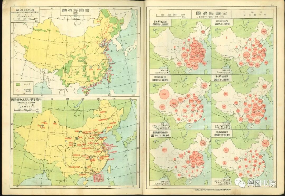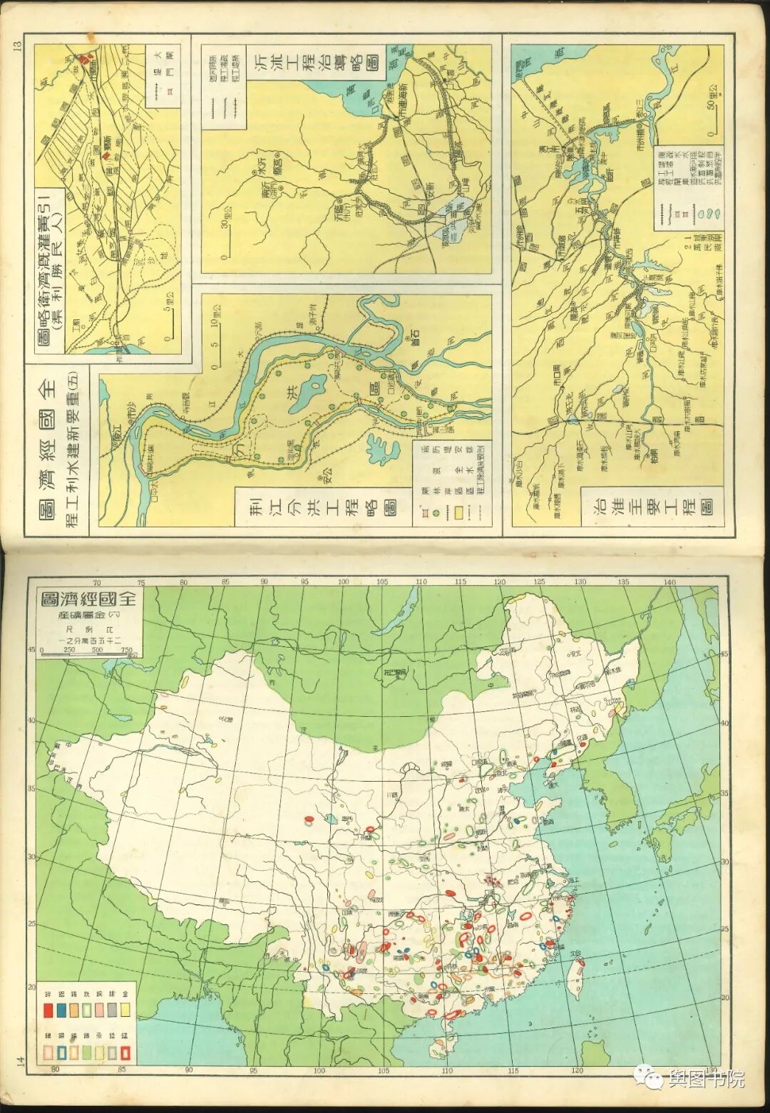 图中重点介绍了中国水利建设成就,这些成就具有非常强的时代意义,淮河,长江荆江段,黄河灌区等,是新中国成立初期的重要水利建设成就。当时矿产普查还没有完成,但是从初步图看,已经能够大致看出中国南北金属矿产的分布。