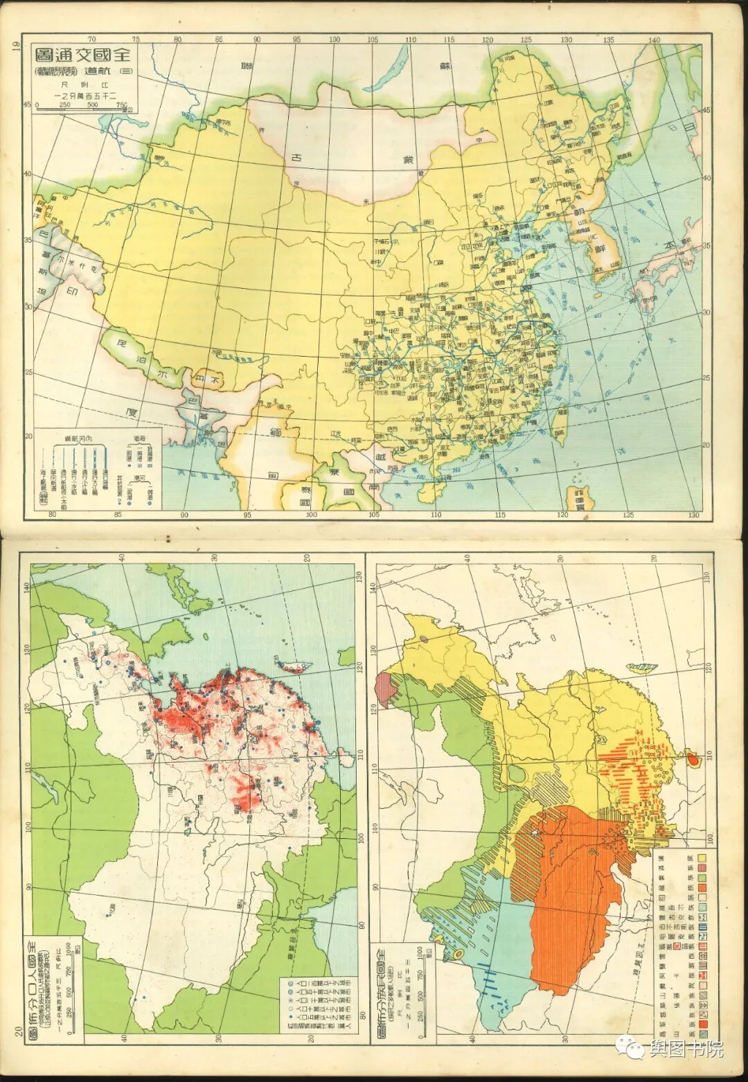 这幅图的另一个特别之处是给出了中国时区图。我们知道,中国地跨经度多,但是使用统一时区。不过1952年,中国却有5个时区,从东到西分别是长白时区,中原时区,陇蜀时区,回藏时区,昆仑时区,分别对应东9区到东5区。从交通情况看,当时交通还是比较薄弱的,所以早先经济建设,也是优先考虑交通建设。