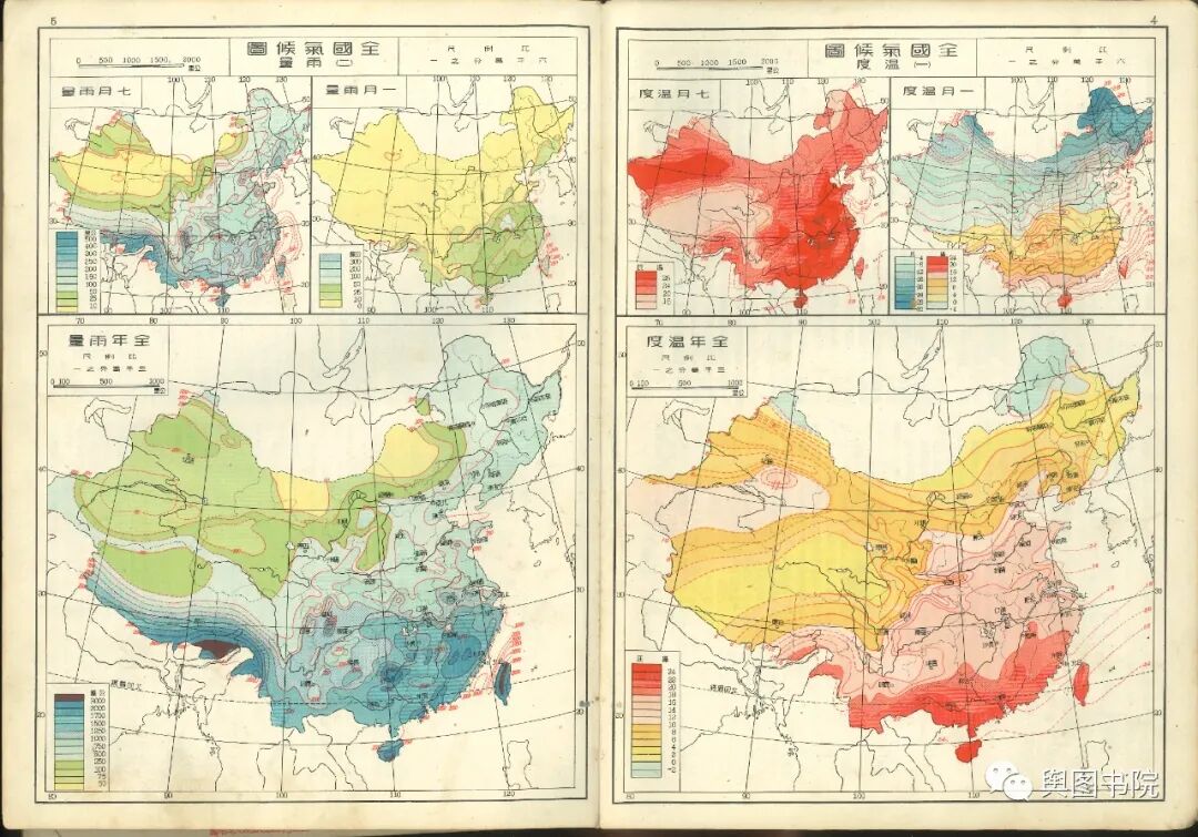 1952年,已经使用插值填色的方式,描绘气温和降水图了,仔细看,这个图,对于东部地区,准确度尚可,但是对于偏远地区,由于缺少记录,很多地方,气象站刚刚设立,当时还没有整年记录,只能依赖于推算,所以误差较大。