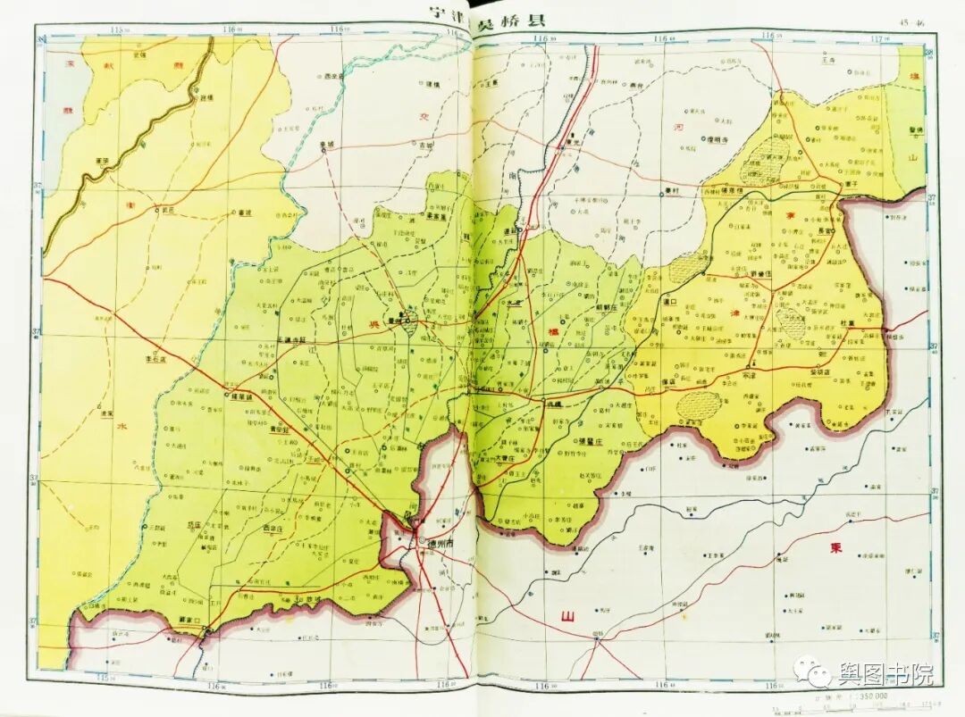 宁津县在1958年划入了原东光县一部分土地,而吴桥县一度属于山东,1952年划入河北,1958年同样是合大县,合并了故城县,景县,形成了图中格局。此时的吴桥县,对德州市区是半包围状态,很像德州的县。这里距离山东德州市中心很近,在今天有通往德州的公交车。