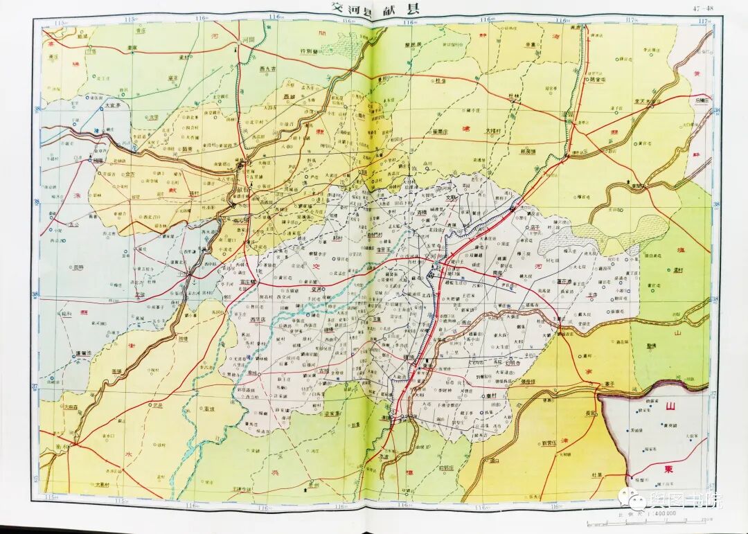 1960年的地图有一个交河县,这个县躲过了1958年的大规模撤县,却没有躲过后期的调整。1983年,交河撤销,这也是唯一一个1960年地图上有,今天却没有的县(不计撤县设区设市等)。当时的交河县,合并了南皮,东光,阜城,泊镇市四个市县,是一个五合一的大县。而当时的献县,也是合并了饶阳,武强之后的三合一大县。这些县在当时都是农业县,还没有成型工业。