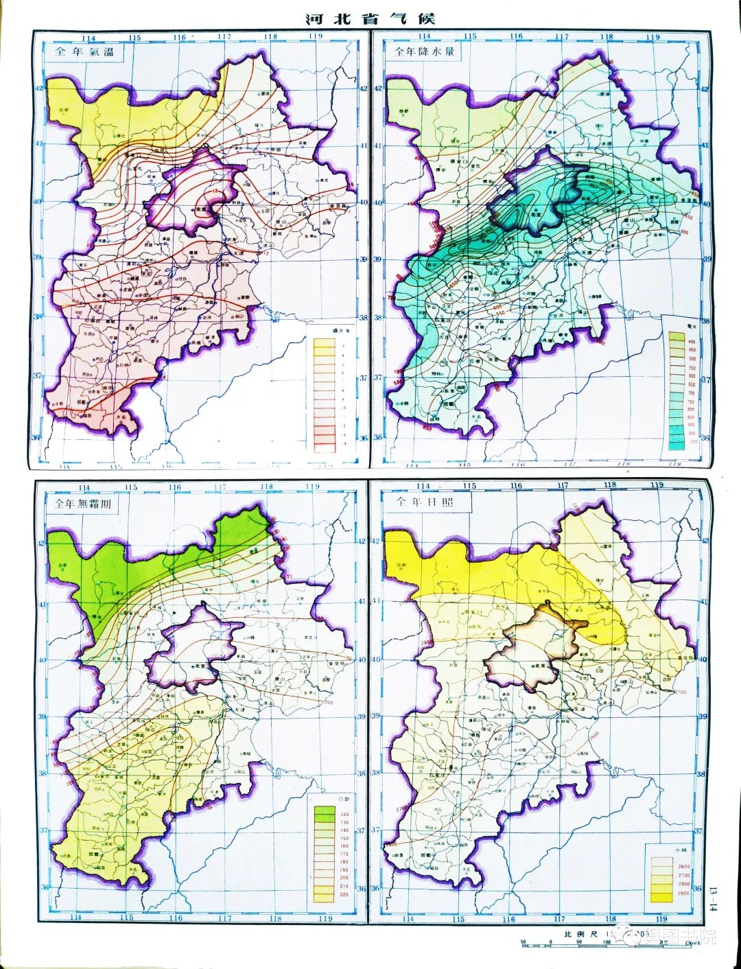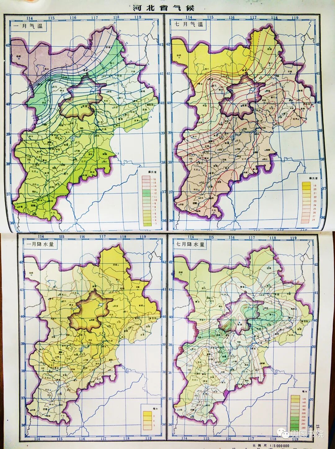 这里面的气候要素处理,除了依赖有限的气象数据(很多地方建国才有),更多是基于计算分析推导而出。通过这个图,我们可以大致看出河北省气候规律。温度方面,西北部高原和平地,不论冬天还是夏天,都表现出巨大的差异。而河北降水多的地方,集中在中北部山地和平原过渡的区域,这里正是迎风坡,利于降水。