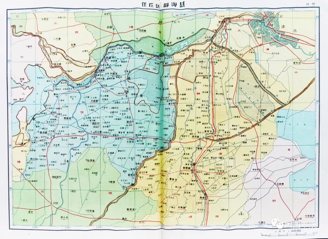 1960年的任丘,是原任丘,交安,大城三县合并而来,这个县得名于西汉一个叫任丘的官员。今天任丘属于沧州市。而静海县,则并入了青县和大城县的一部分,形成图中格局。