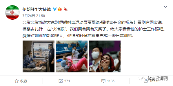 伊朗使馆介绍,福鲁吉本是一名护士,他能够从事竞技体育十分偶然也非常晚,这是他第一次站在奥运赛场上。有中国网友打趣说,福鲁吉扎针一定“快准狠”,伊朗使馆于是晒出了一张福鲁吉在疫情期间的护士工作照。