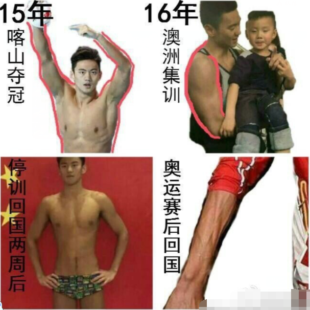 先来看一组对比照,大概可以明白他为什么成绩会下降得如此快。短短一年半的时间,他全身肌肉大面积萎缩,根本达不到专业运动员的水平。
