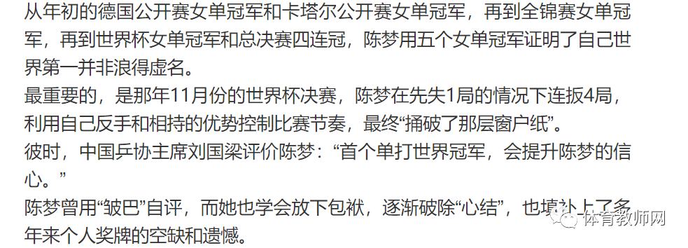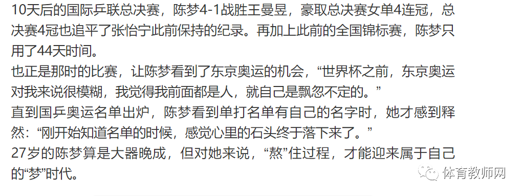 蹭着拿冠军,心里不舒服其实陈梦比赛成绩并不算差,东京奥运周期,陈梦多次获得国际乒联职业巡回赛和总决赛冠军,并于2018年排名世界第一。