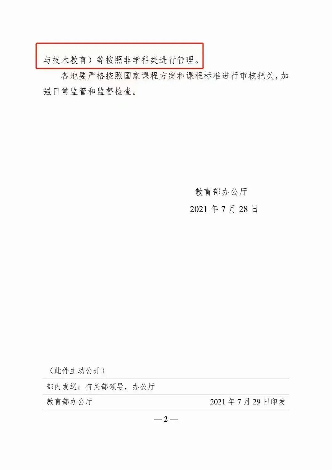 2021年7月28日,教育部办公厅发布《关于进一步减轻义务教育阶段学生作业负担和校外培训负担的意见》,其中提到指导各地做好校外培训(包括线上培训和线下培训)治理工作,明确义务教育阶段校外培训学科类和非学科类范围。