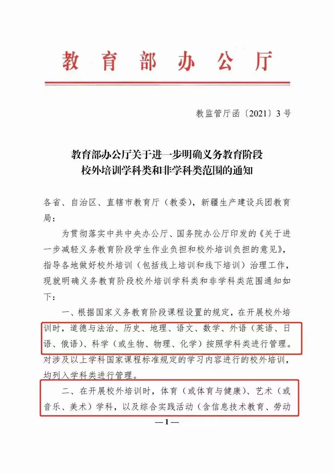 为贯彻落实中共中央办公厅、国务院办公厅印发的《关于进一步减轻义务教育阶段学生作业负担和校外培训负担的意见》,指导各地做好校外培训(包括线上培训和线下培训)治理工作,现就明确义务教育阶段校外培训学科类和非学科类范围通知如下: