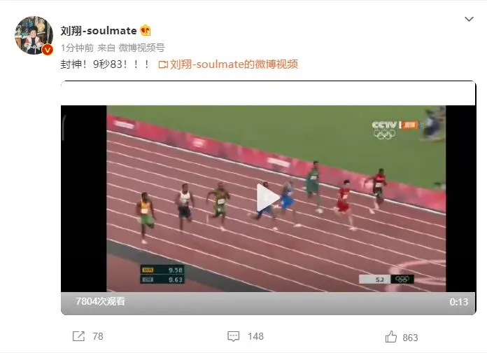 为此,110米栏飞人刘翔更新社交媒体,祝贺苏炳添:“封神!9秒83!!!”