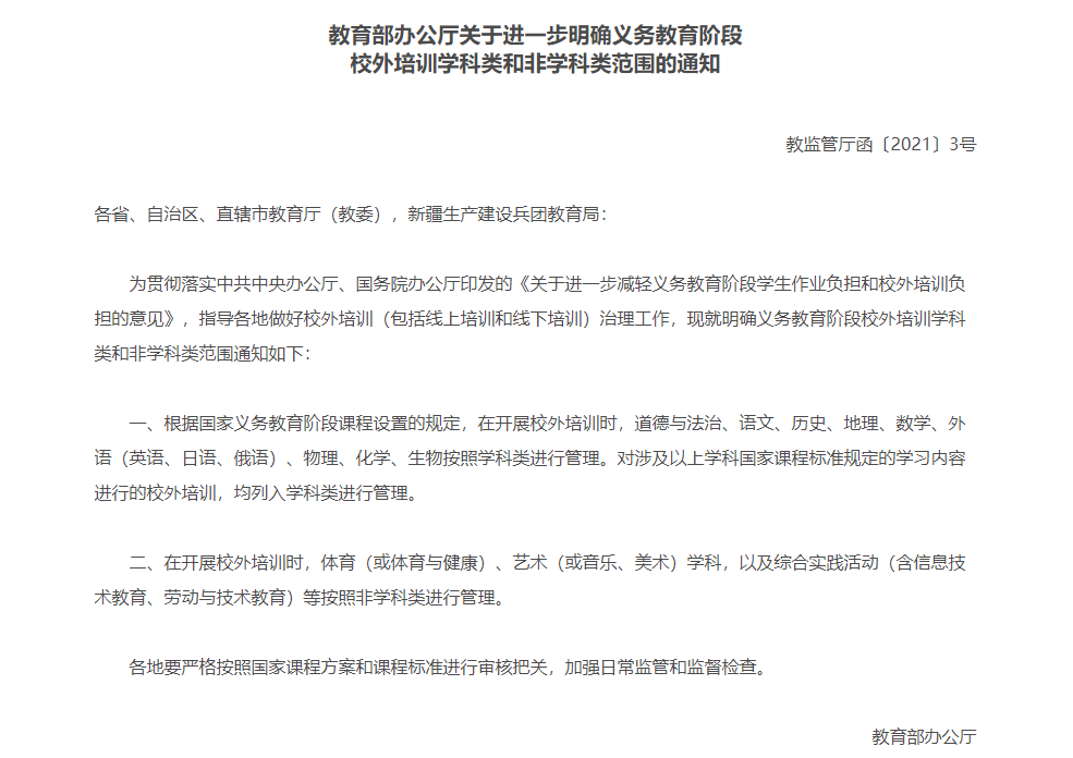 文件公开前后,有声音认为,学科类校外培训机构要“凉”了,中概教育股纷纷暴跌。会这样吗?先来看下《意见》中对学科类培训的一些重点规定吧。