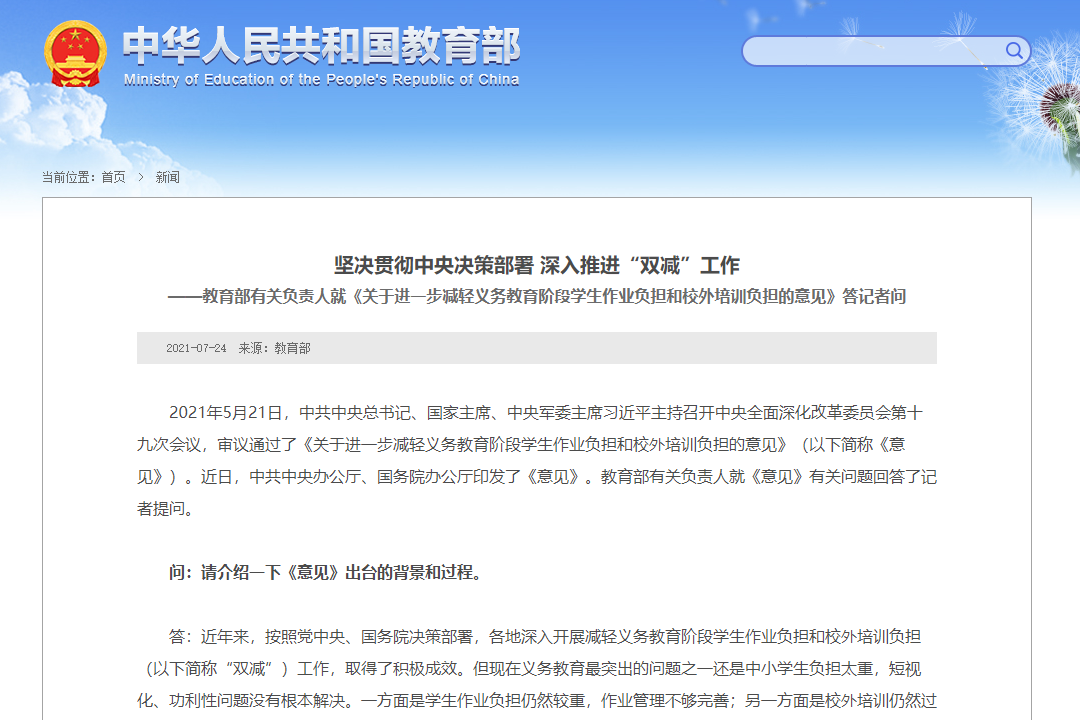 7月24日,中共中央办公厅、国务院办公厅印发了《关于进一步减轻义务教育阶段学生作业负担和校外培训负担的意见》(以下简称《意见》。