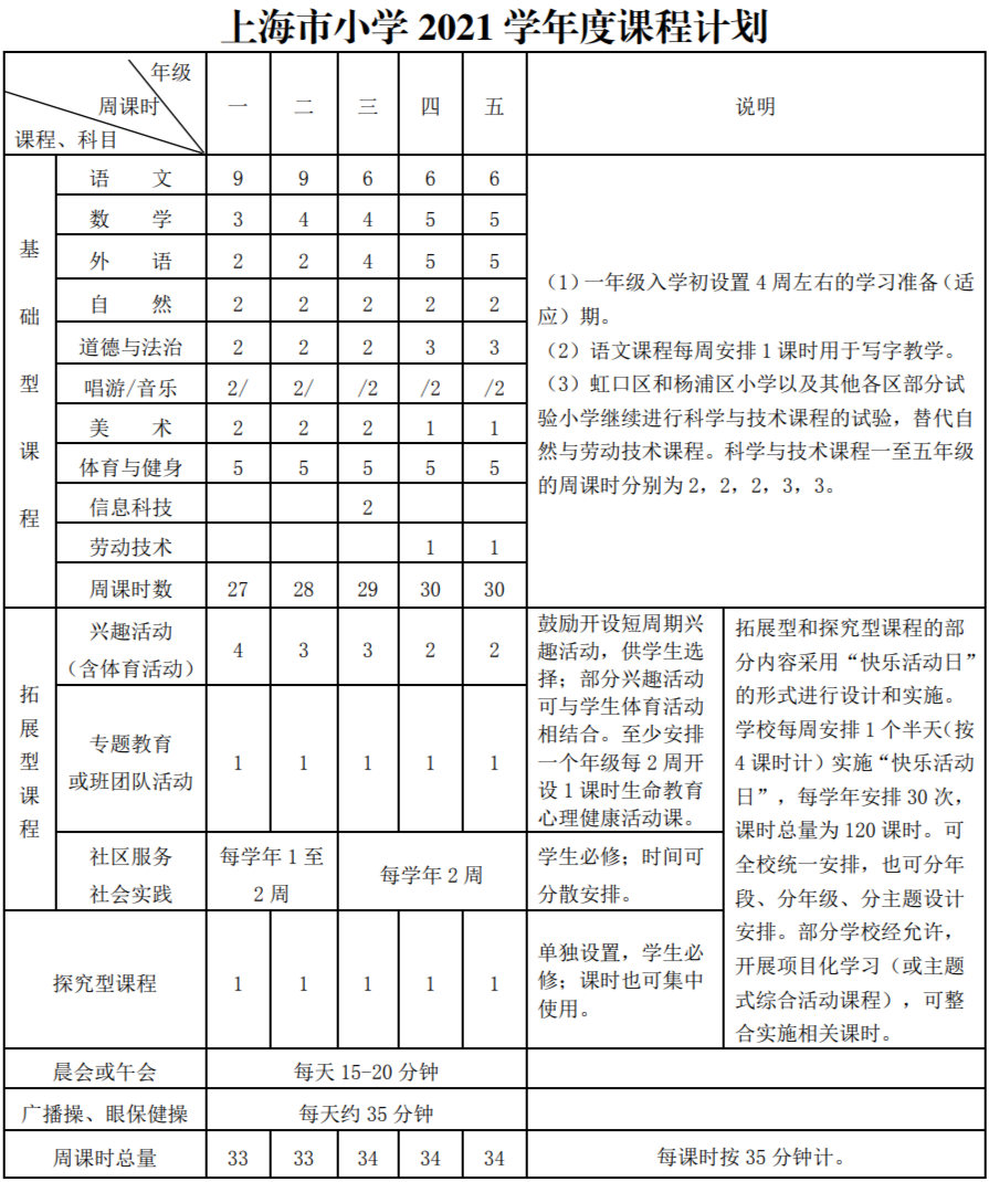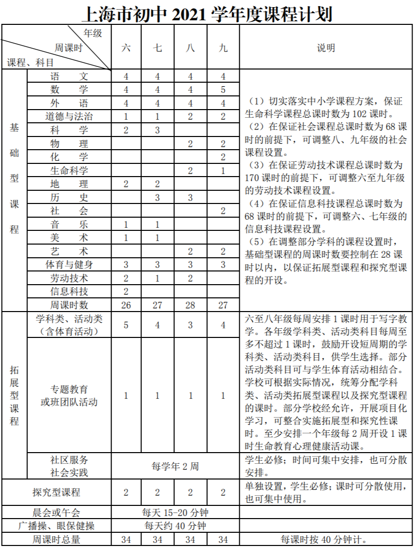近日,上海市教委印发《上海市中小学2021学年度课程计划及其说明》的通知,要求各区教育行政部门及中小学要严格按照中央和本市有关深化教育教学改革、深入实施素质教育、进一步规范课程教学工作、减轻学生过重课业负担的要求,加强教育管理,认真执行课程计划,努力提高教育质量。