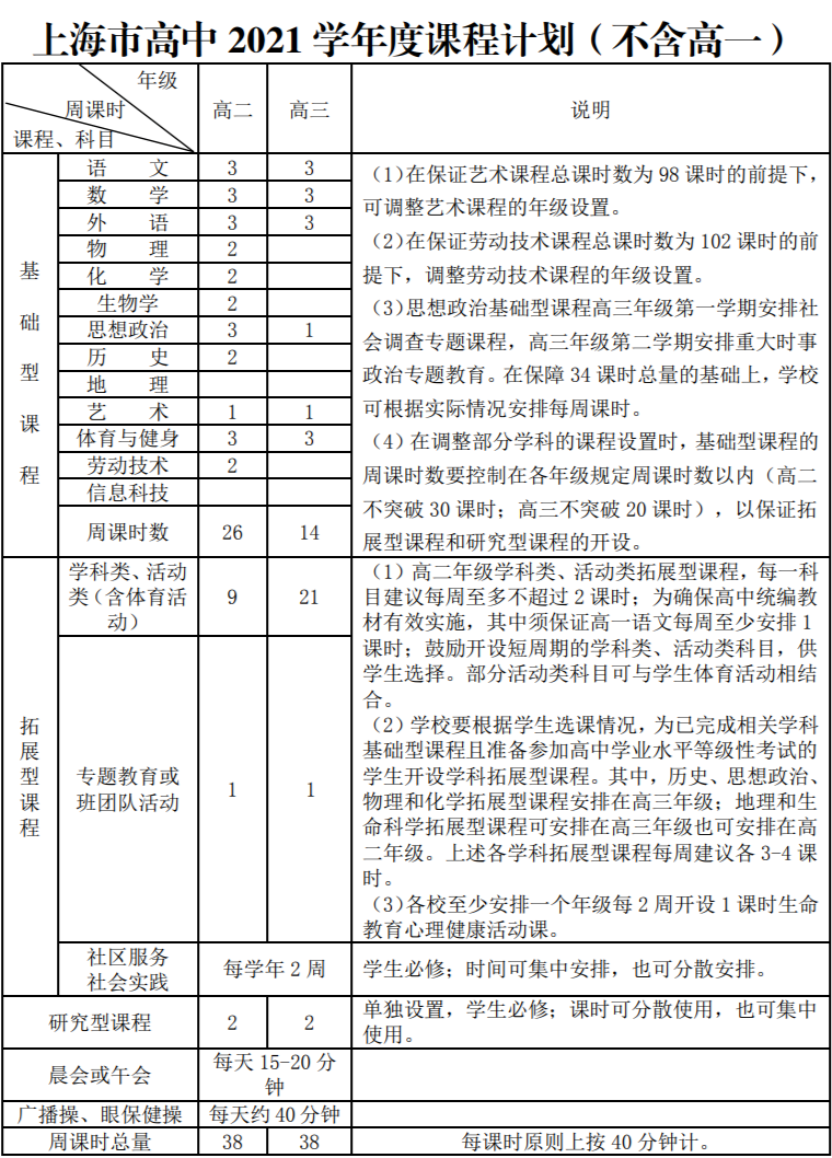 ※高中各年级全学年教学活动的总时间为40周。其中,社会实践活动时间为2周。高二年级授课时间按34周计,复习考试、节假日及重大活动时间为4周;高三年级授课时间按30周计,复习考试、节假日及重大活动时间为8周。五、高中各年级每课时原则上按40分钟计,每周课时总量为38节。学校要合理安排高中各年级的基础型课程、拓展型课程和研究型课程的课时,原则上不能将拓展型课程和研究型课程的课时移作补课用。从2021学年高一年级开始,本市普通高中将施行新课程新教材,具体要求按照另行发布的《上海市普通高中课程实施方案》执行。