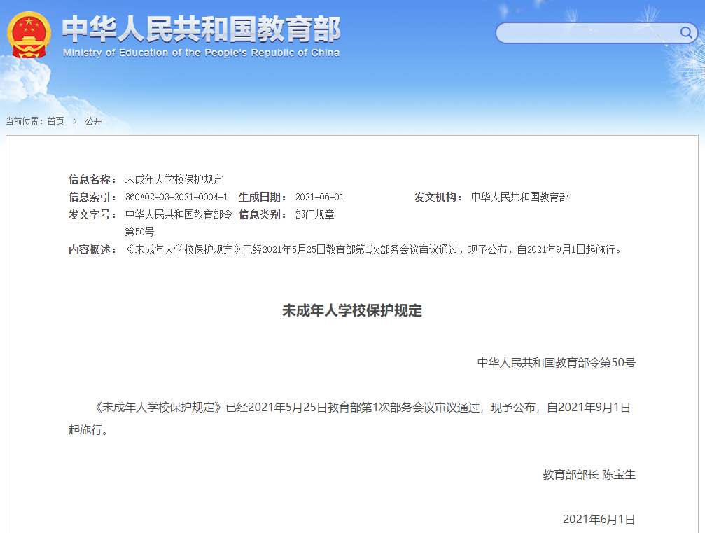 2021年6月1日教育部发布《未成年人学校保护规定》文件。