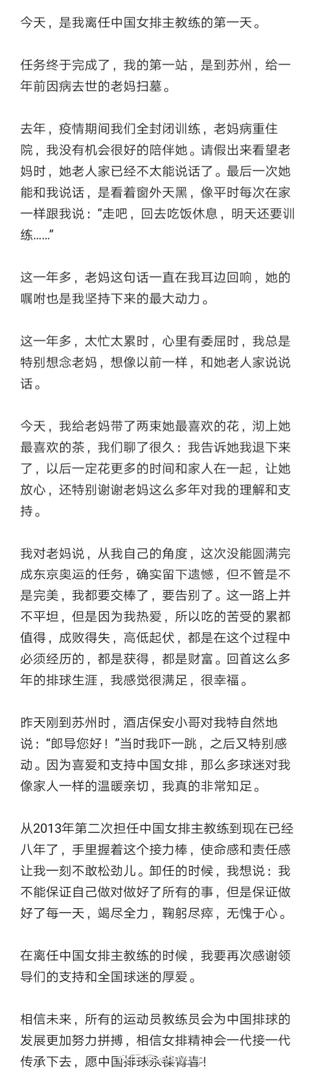 9月1日中午,郎平通过个人社交媒体宣布自己已经正式从中国女排主教练岗位上离任,今天是她离任的第一天。