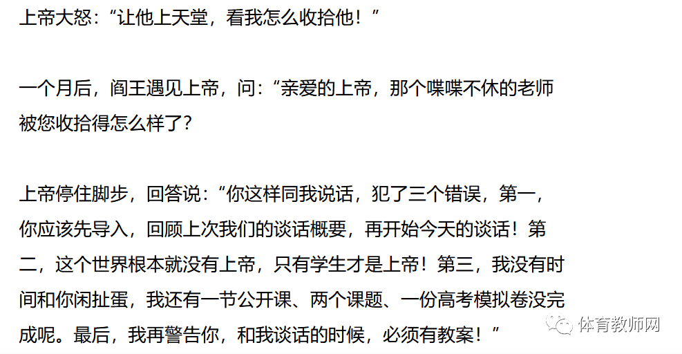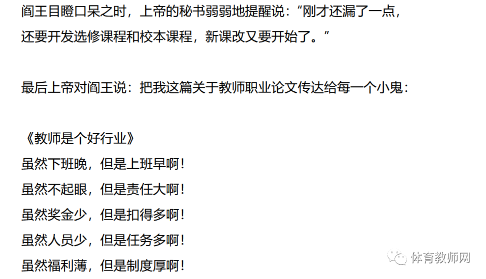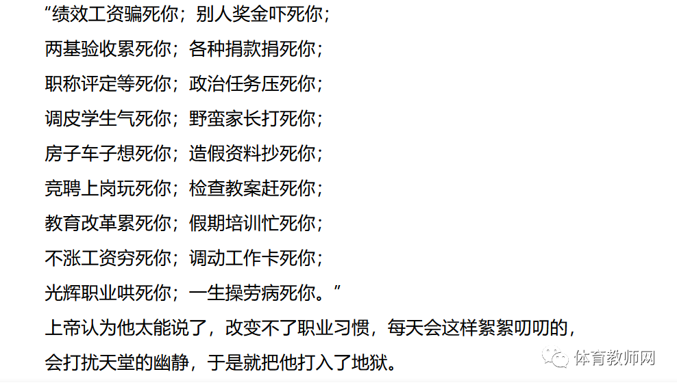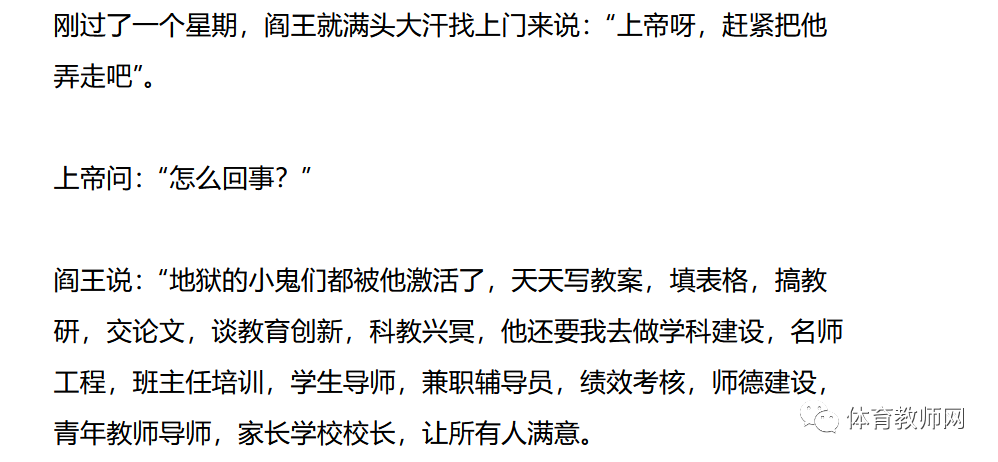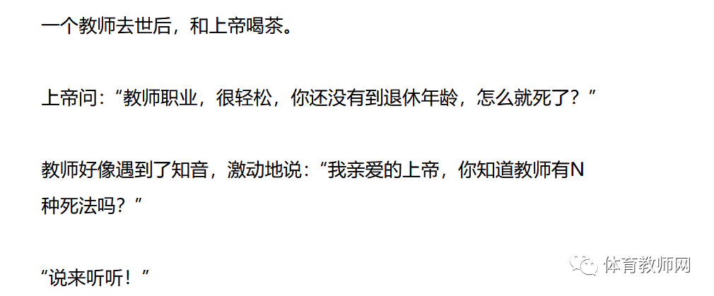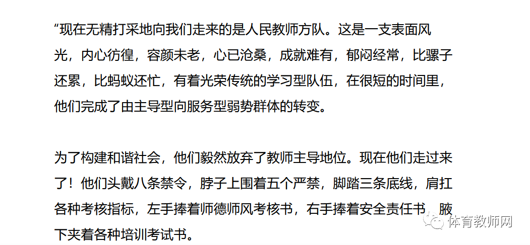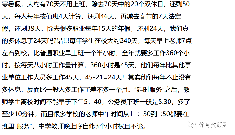 记得第一次参加工作回家,跟父母说工作很累...... 父亲总是很生气的说,知足吧,一天才那么三四节课加起来还不到三个小时,有什么好累的,邻居总是说当老师好啊,很轻松,工作时间很短。尤其你们当体育老师的不需要改作业啊,随便让学生跑跑步就没事了,这么好的工作不好找啊......我内心不知道怎么回答,说老师忙,说老师累好像都是多余的,没有人相信。