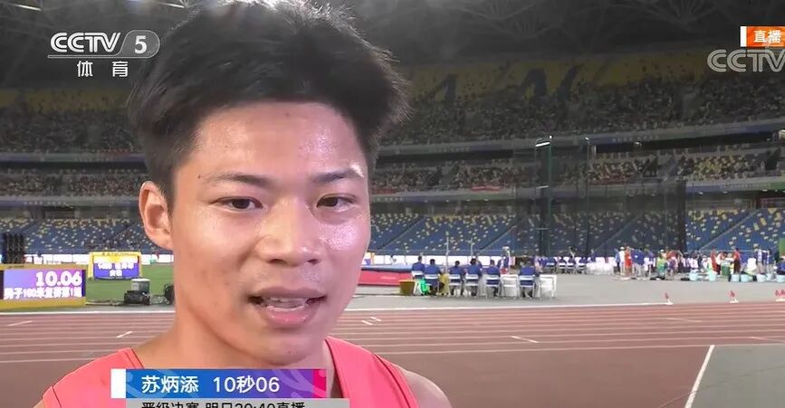 2009年,他以10秒52的成绩获得第6名;2013年和2017年,苏炳添的决赛成绩分别是10秒12和10秒10,但彼时输给了跑出10秒08的张培萌和10秒04的谢震业。