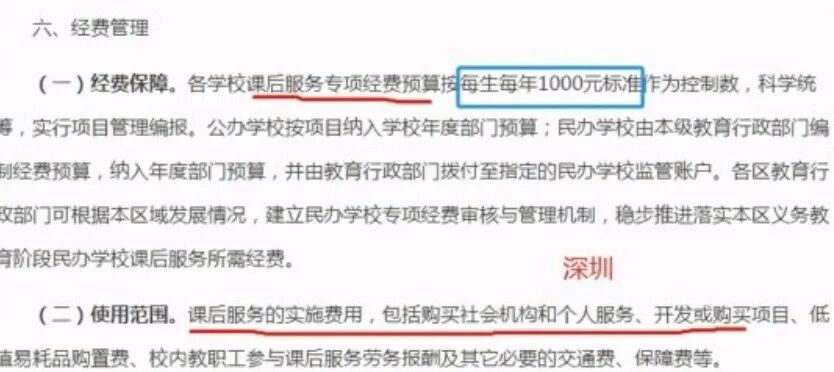 同样公布出补助标准的还有深圳市,在下达的文件中,指出经费是由政府保障的,学生每年需要交1000元的费用,作为课后延时的服务费,并且学校不能再进行额外的收费。